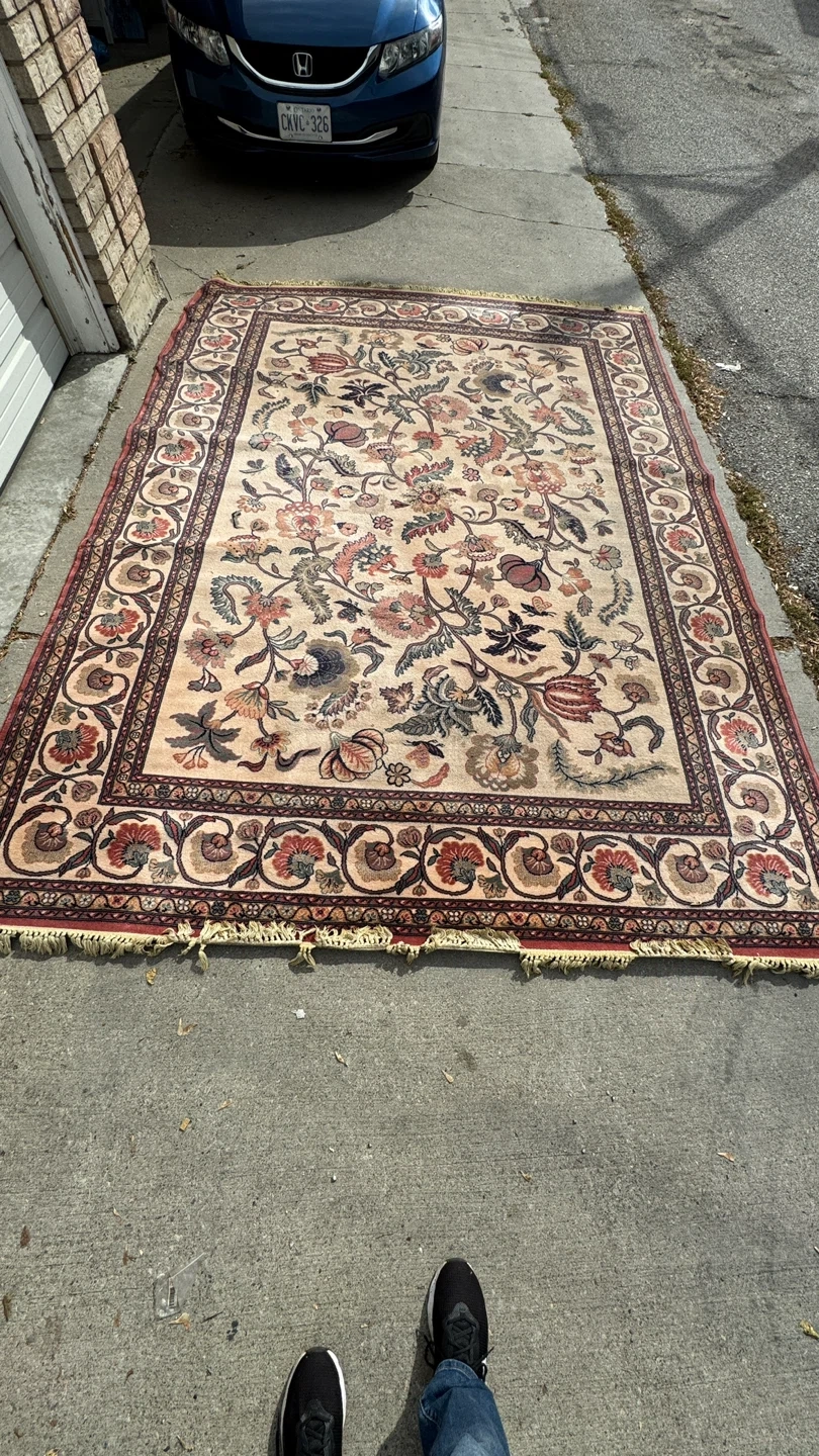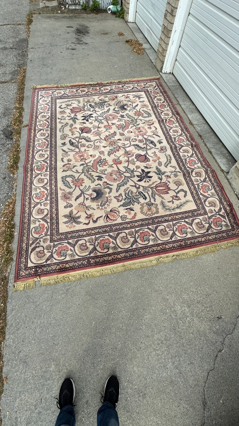 Selling a vintage area rug with a beautiful floral pattern. It's perfect for adding a touch of elegance to any room. The rug has a detailed border and a classic design. It's in good condition and ready to be enjoyed in your home. Very good condition and all fringes are fully intact and clean.