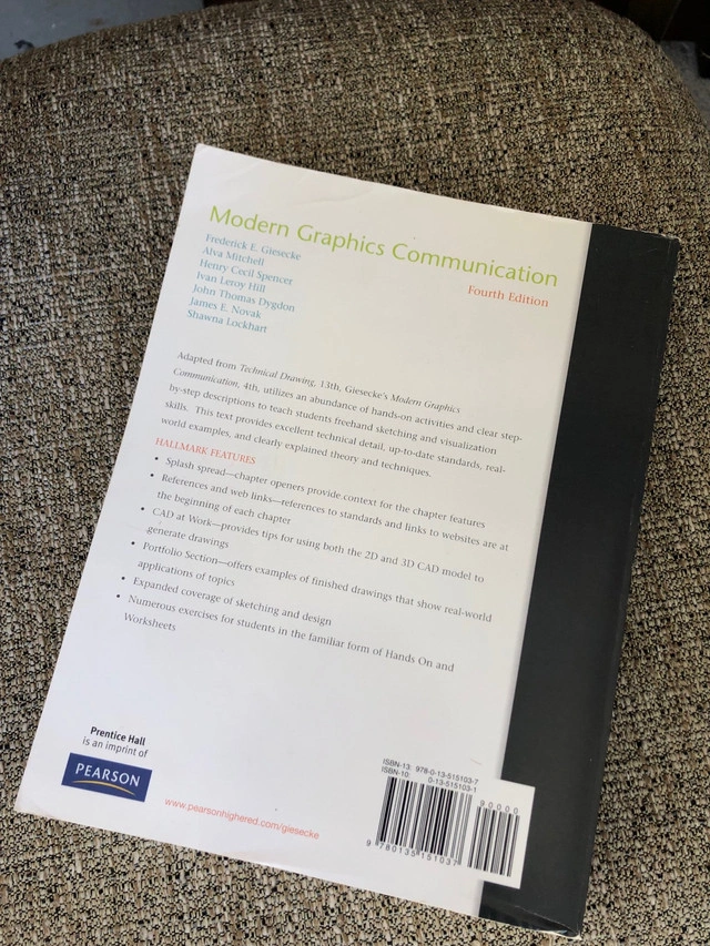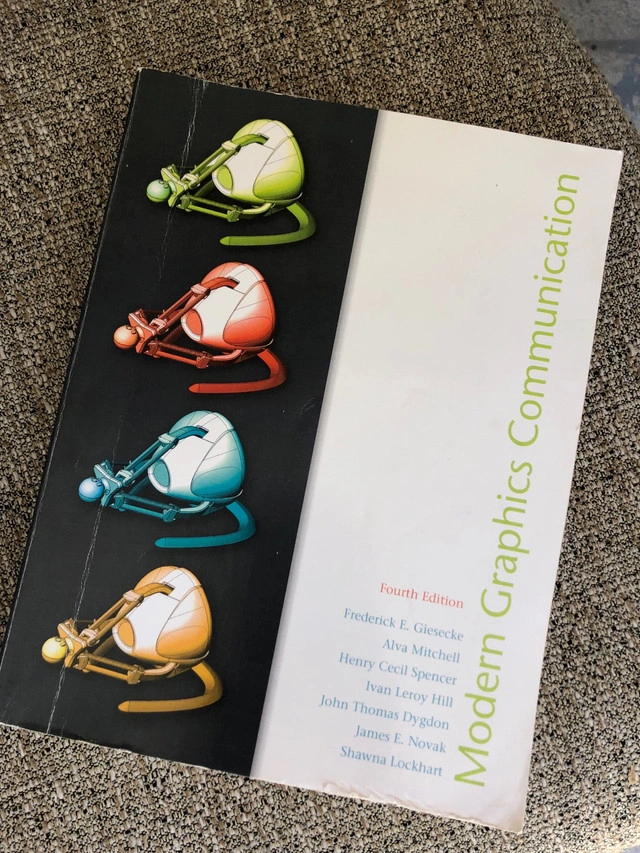 This is the fourth edition of Modern Graphics Communication textbook, providing students with clear step-by-step contributors to teach students freehand sketching and visualization skills. The text provides modern technical detail and industry standards with real-world examples and clearly explained theories and techniques. Specifications: * Fourth Edition * Authors: Frederick E. Giesecke, Alva Mitchell, Henry Cecil Spencer, Ivan Leroy Hill, John Thomas Dygdon, James E. Novak, Shawna Lockhart * Publisher: Prentice Hall * ISBN-13: 978-0135103107 * ISBN-10: 0135103102 I am looking to sell this textbook for $40. If this ad is still up, it's still available!