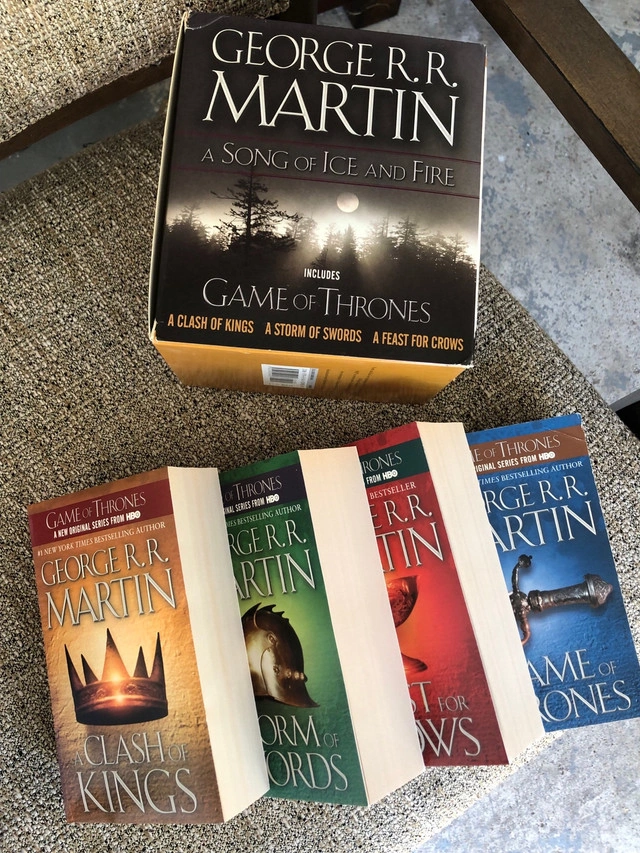 Dive into the epic world of Westeros with this collection of George R.R. Martin's "A Song of Ice and Fire" series, known as the Game of Thrones books. These books will transport you to a realm of knights, dragons, and intricate political intrigue. Note that these are used copies, showing some signs of wear. Great opportunity to own the books that started it all! Here’s what you’ll get: * A Game of Thrones (Book 1) * A Clash of Kings (Book 2) * A Storm of Swords (Book 3) * A Feast for Crows (Book 4) Used books can be a treasure trove of stories and adventures—just like finding a map to hidden gold! If the ad is up, the books are still available, ready to start their next chapter with you.