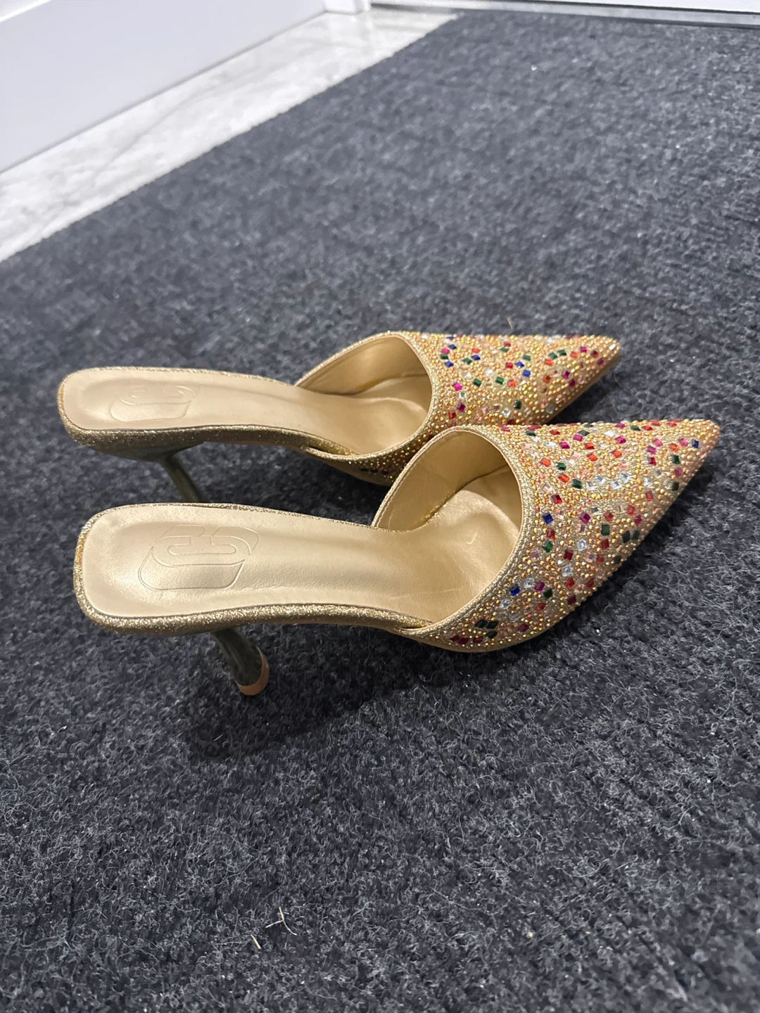 These gold mules are sure to add some sparkle to your outfit! They feature a pointed toe and are embellished with colourful gems. Size 39