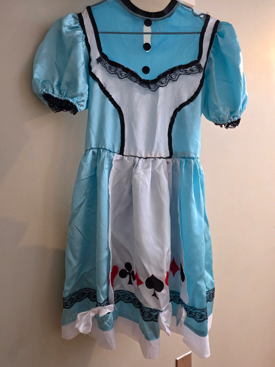 Selling an Alice in Wonderland costume with striped leg warmers. It's perfect for dress-up or Halloween! The costume is in good condition and ready for a new adventure