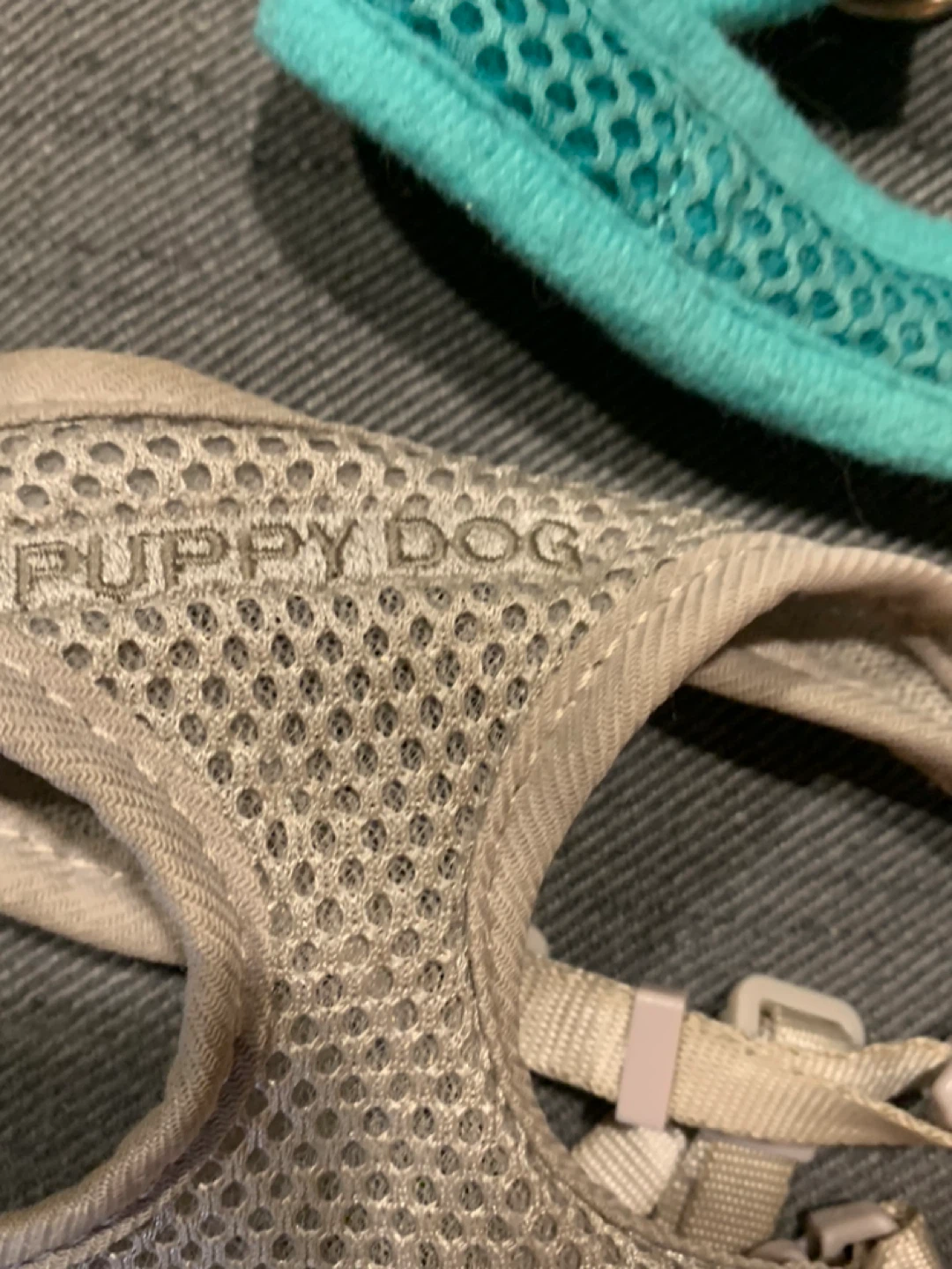 Selling a variety of dog harnesses! There's a Downtown Pet Supply harness in a nice teal colour, a Rabbitgoo harness in black, and another harness with 'Puppy Dog' on it in a light grey colour. Great for walks around the neighbourhood!