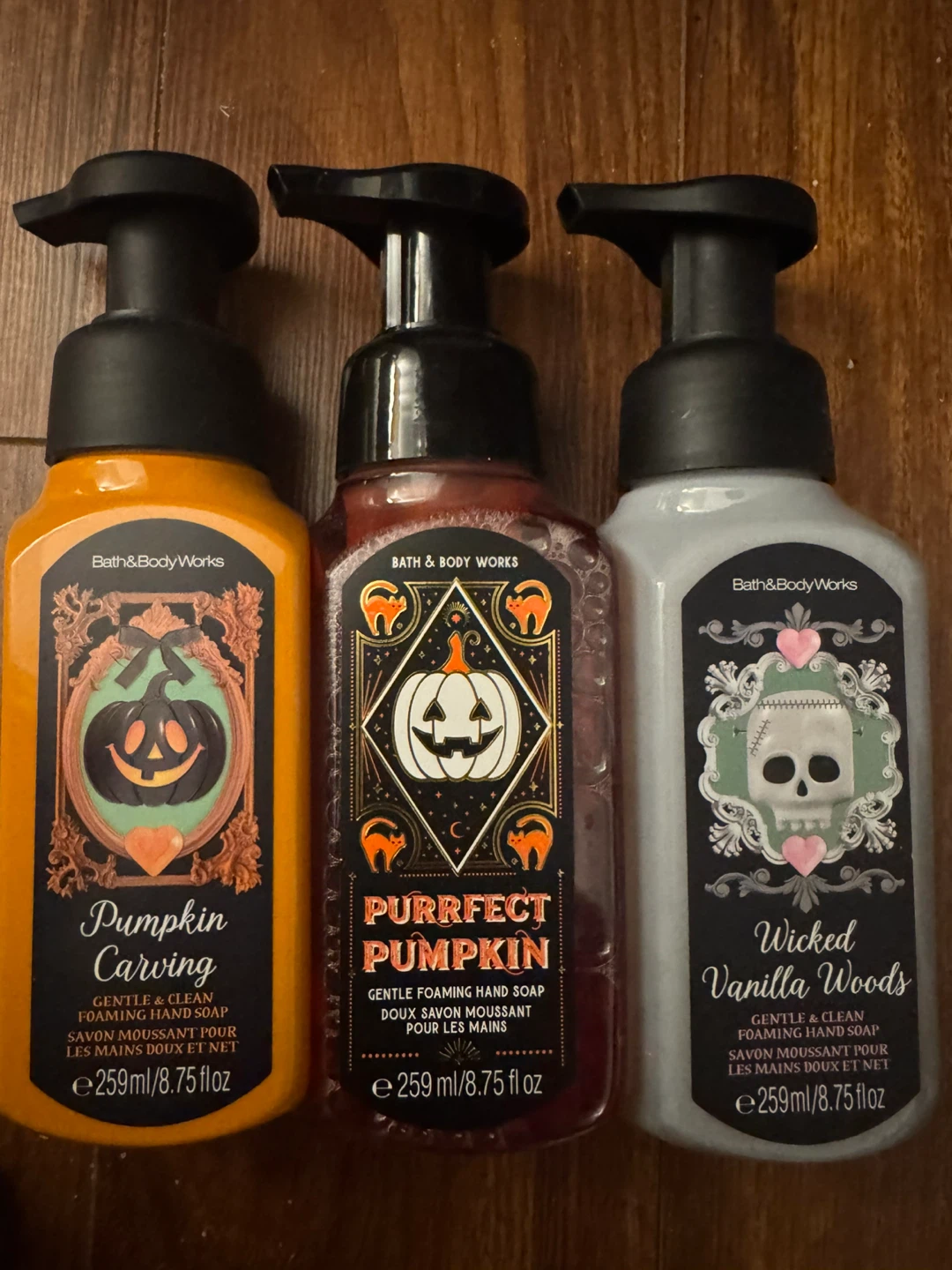 Selling three Bath & Body Works gentle foaming hand soaps from the Halloween collection! You'll get Pumpkin Carving, Purrfect Pumpkin, and Wicked Vanilla Woods. Each bottle contains 259ml / 8.75 fl oz