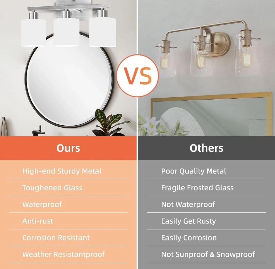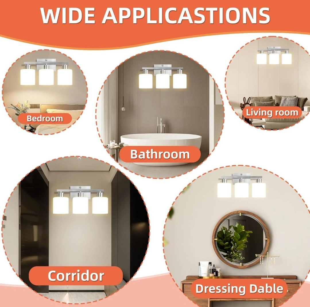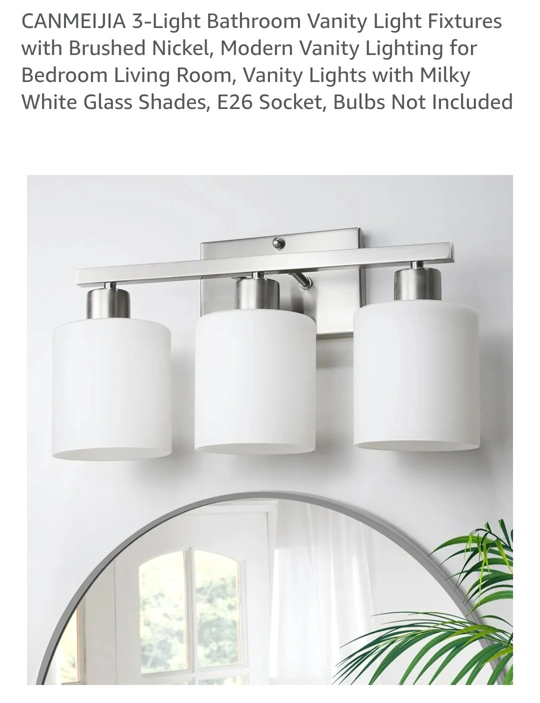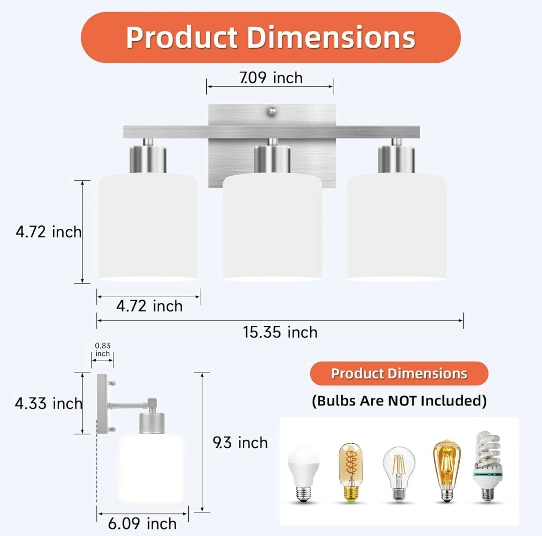 Add a touch of modern elegance to your bathroom with this CANMEIJIA 3-light vanity fixture! It features a brushed nickel finish and milky white glass shades, perfect for any bathroom, bedroom, or dressing table. Please note that bulbs are not included. It is made with high-end sturdy metal and toughened glass. The dimensions are: 7.09 inch x 15.35 inch x 9.3 inch