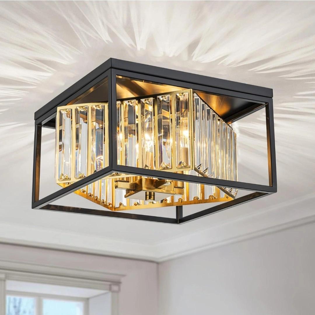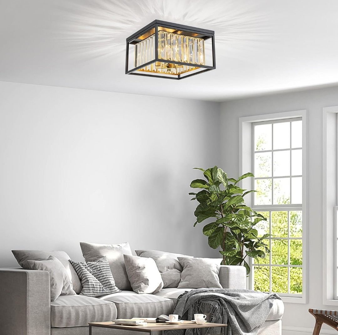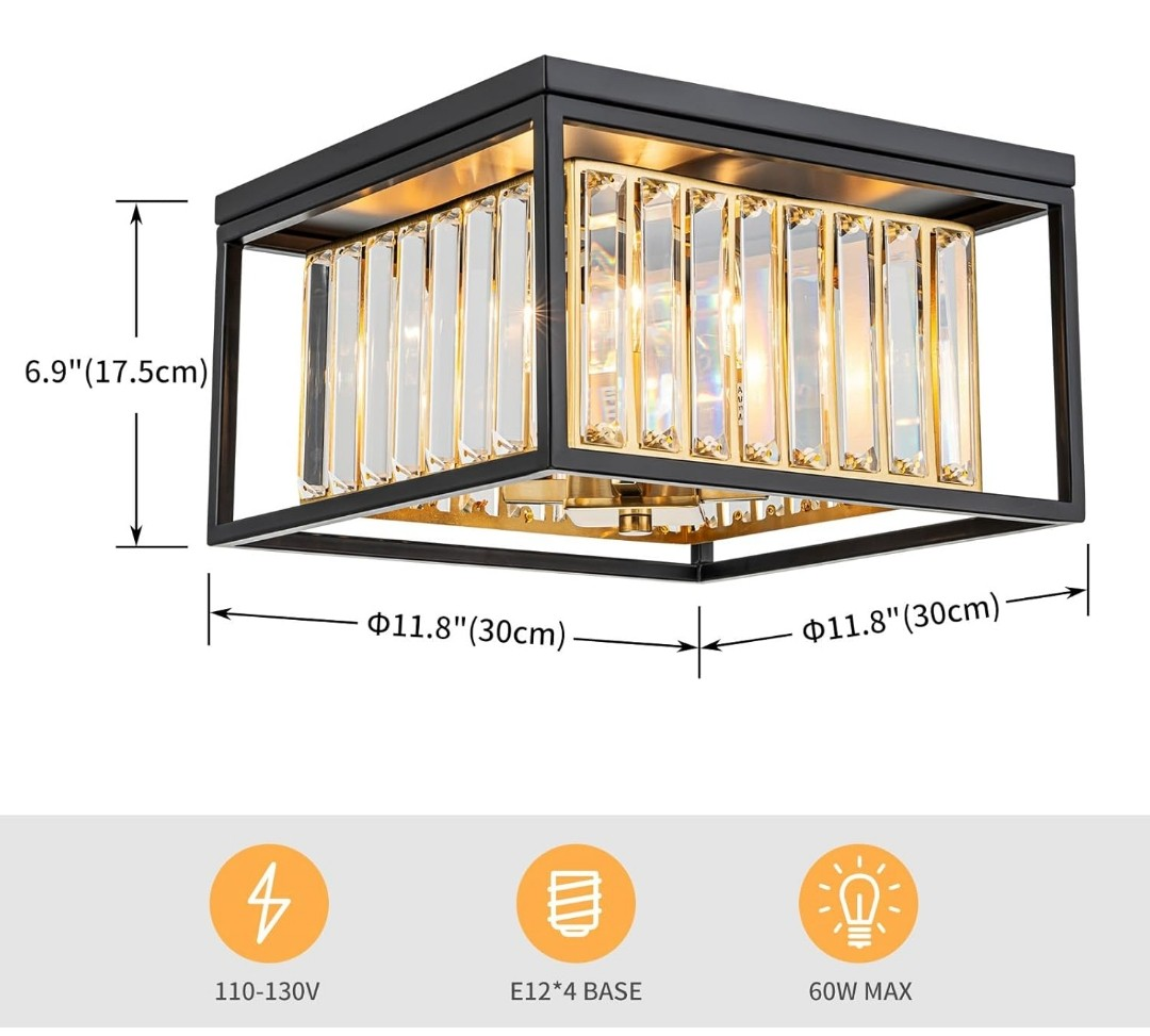 Add a touch of elegance to your home with this flush mount ceiling light fixture! It features a black frame with crystal accents, creating a modern and sophisticated look. The fixture measures approximately 11.8 inches (30cm) in diameter and 6.9 inches (17.5cm) in height. It uses E12*4 base bulbs (bulbs not included) and is compatible with dimmable bulbs and dimmer controllers