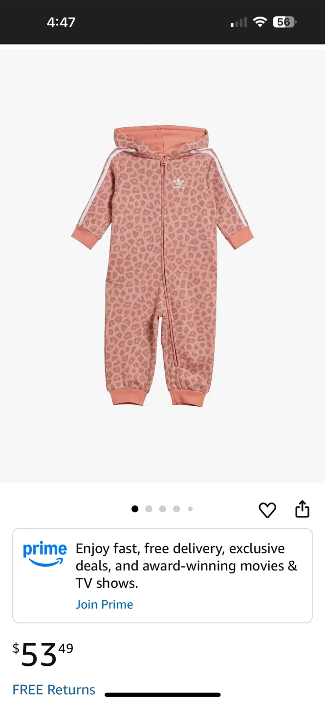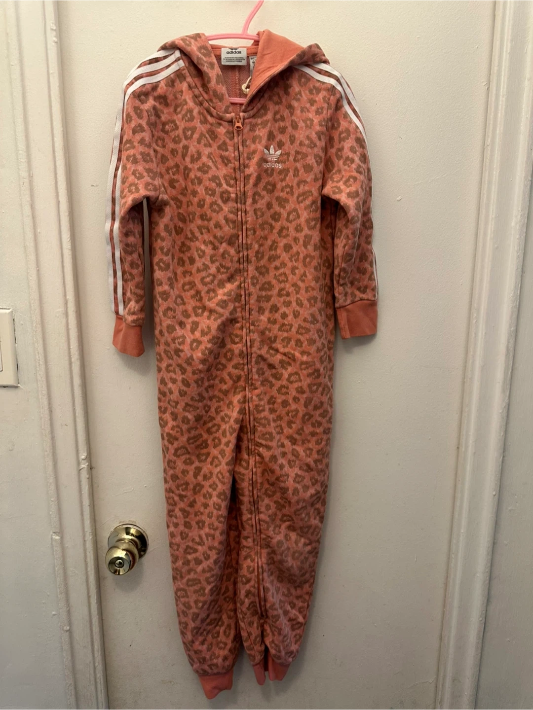 This adorable Adidas romper features a fun leopard print and the classic three-stripe design on the sleeves. It has a cozy hood, a full zipper for easy changes, and cute little ears on top of the hood. Perfect for keeping your little one stylish and comfy! Used only twice