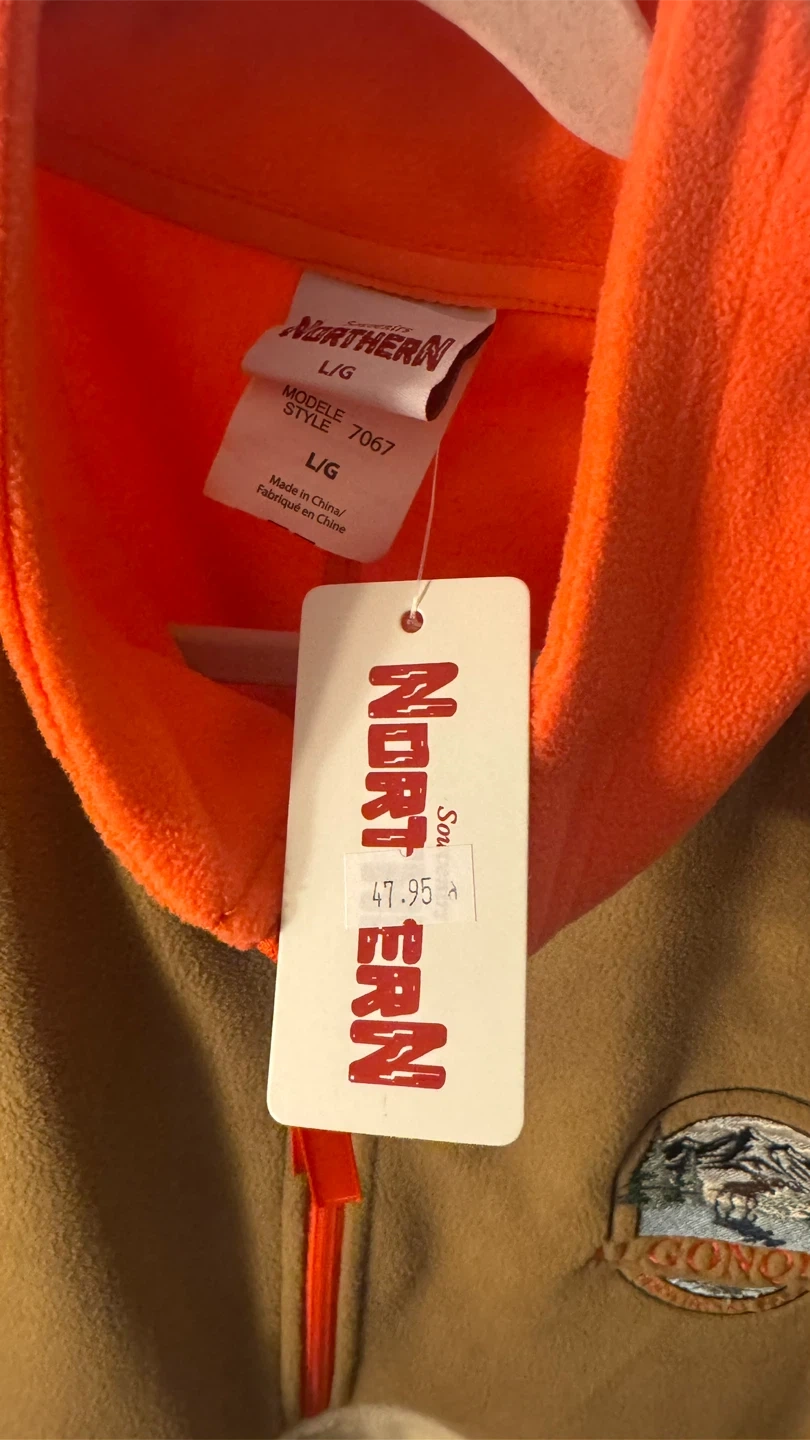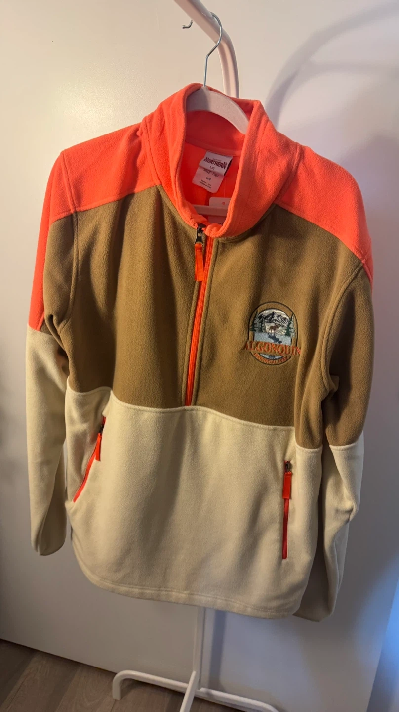 Cozy up in this Northern Getaway fleece pullover! It features a unique Algonquin design and a comfy quarter-zip. The size is L/G, perfect for layering on those chilly Canadian evenings. Originally bought for $47.95. Unisex.