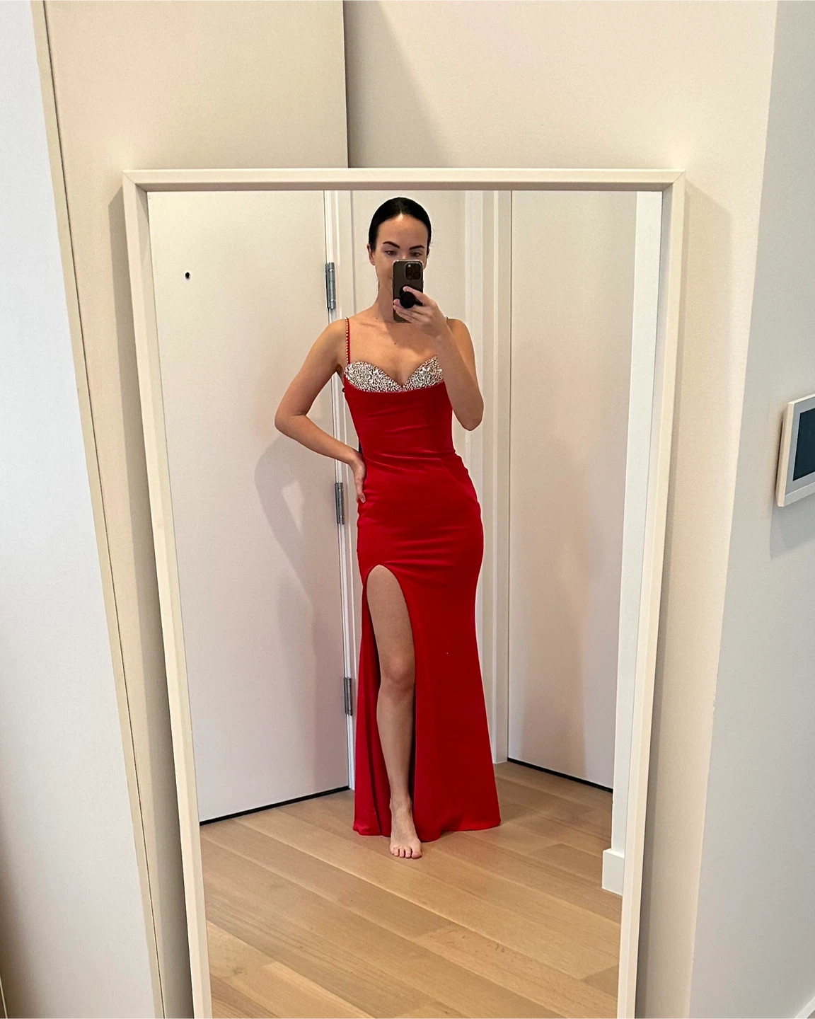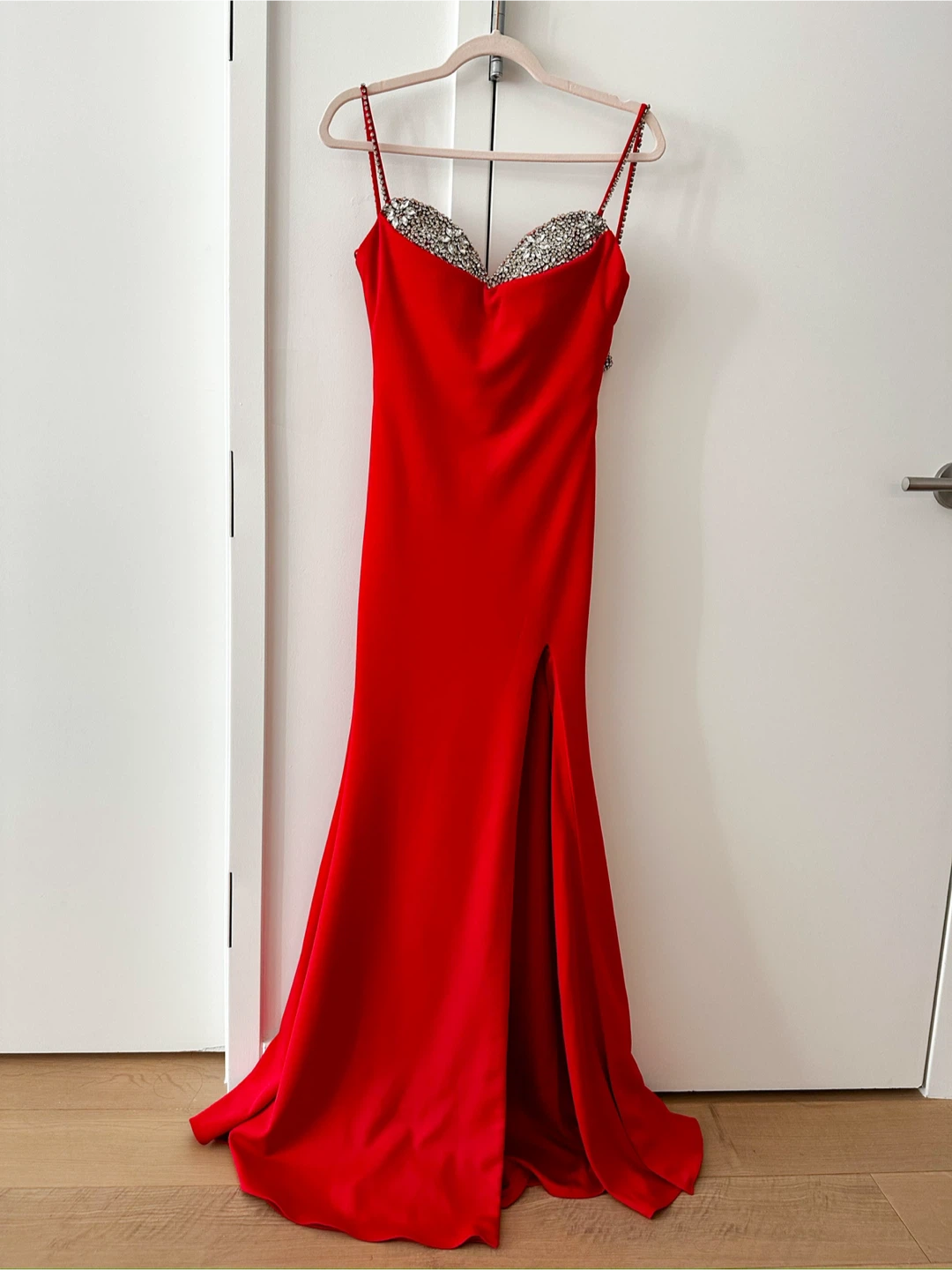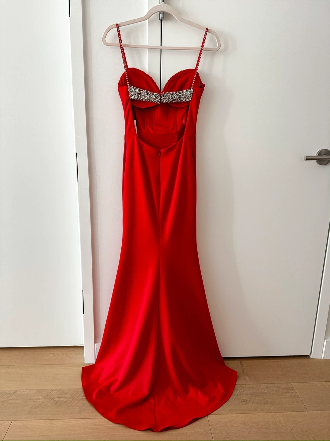 NEW with tag. Selling a beautiful red dress JOVANI in size 0! It features beautiful stone details. Perfect for a special occasion!