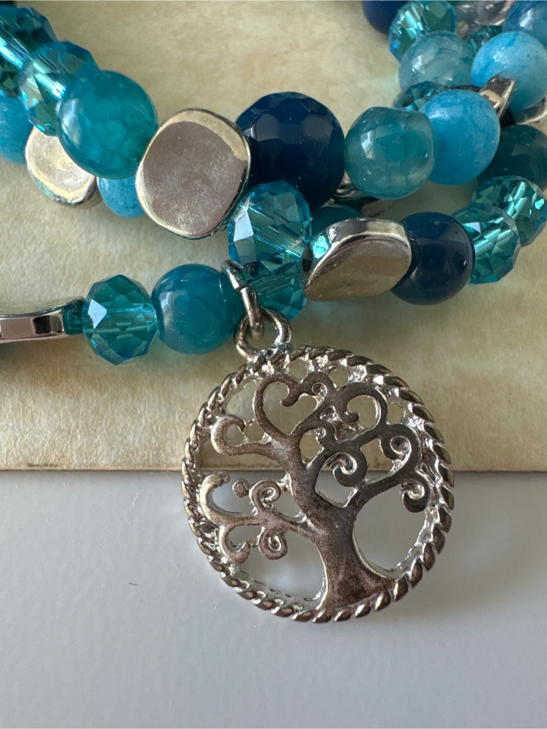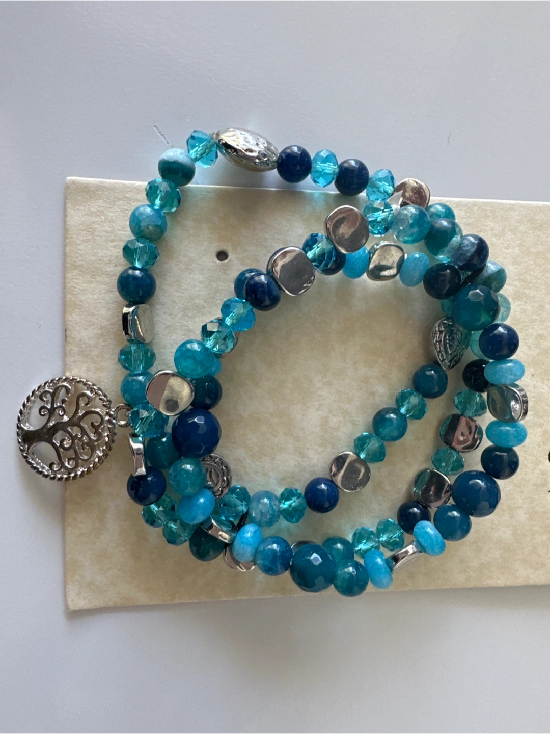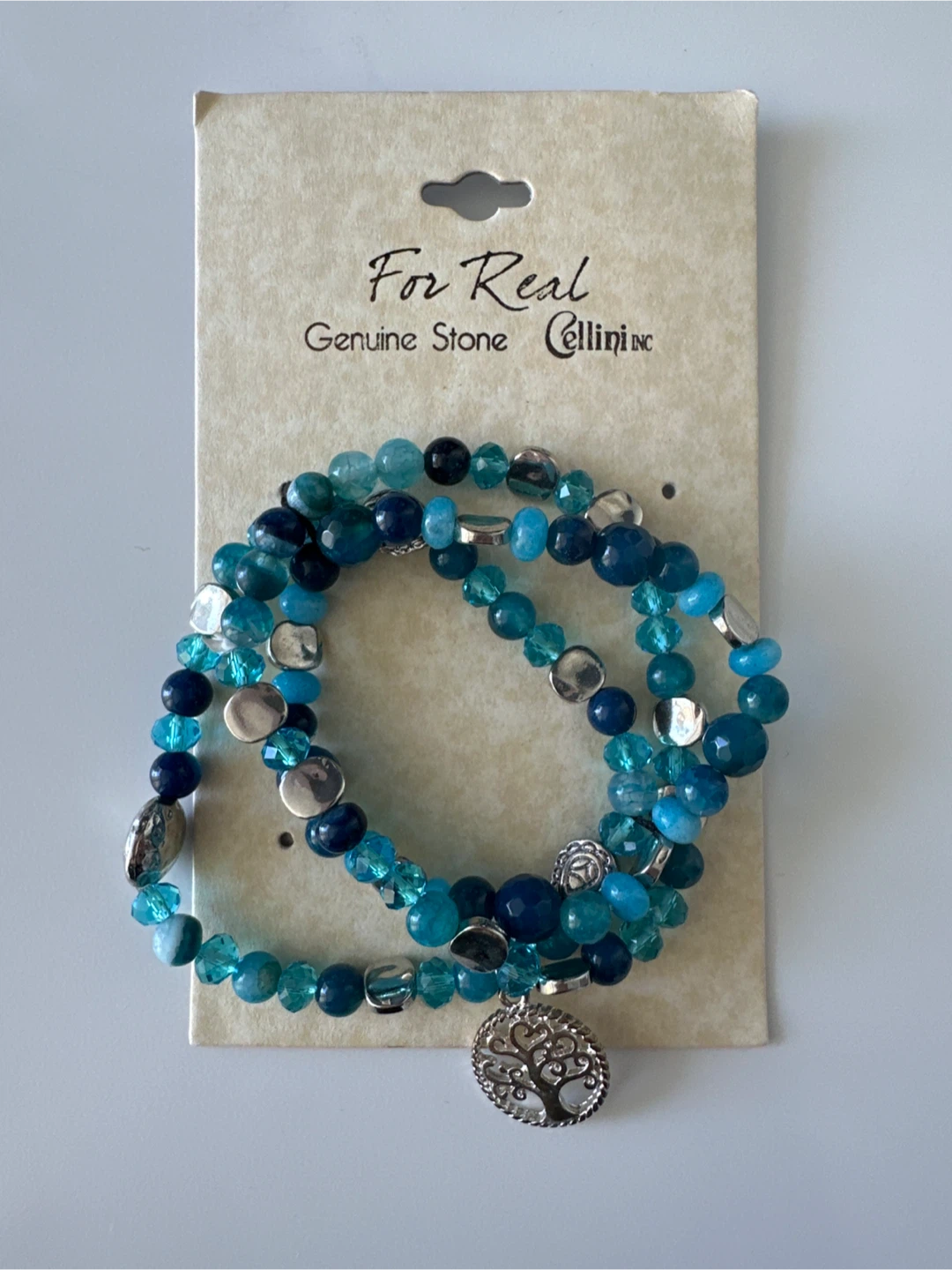 This is a lovely beaded bracelet from For Real Cellini Inc. It features different shades of blue beads and silver accents. The bracelet also has a tree of life charm. It's a beautiful piece to add to your jewellery collection! genuine stone Check my other listing if you pick more than one item you get discount