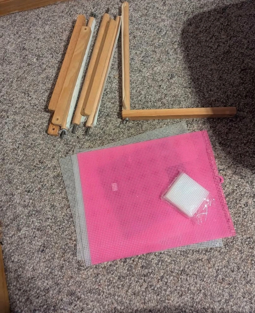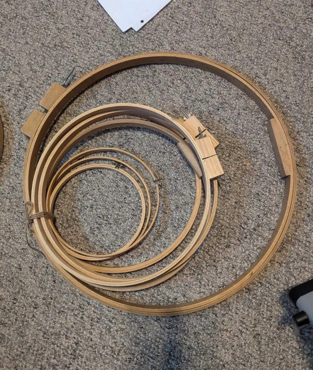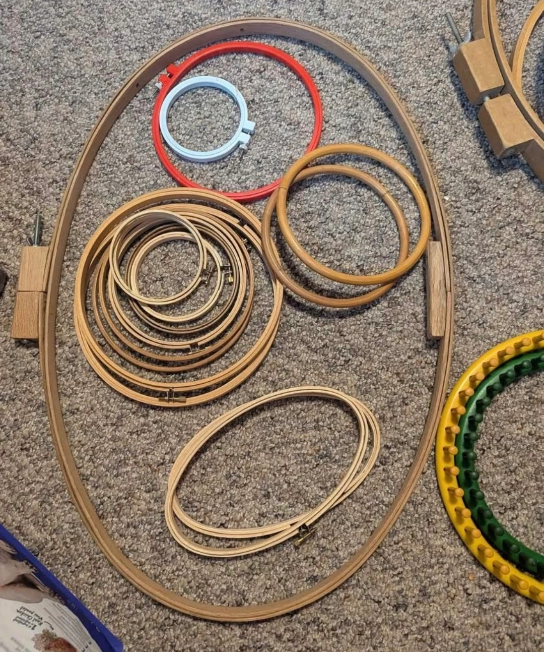 A collection of embroidery hoops in various sizes and materials, plus some other crafting supplies. Great for getting started on a new project or stocking up your craft room!