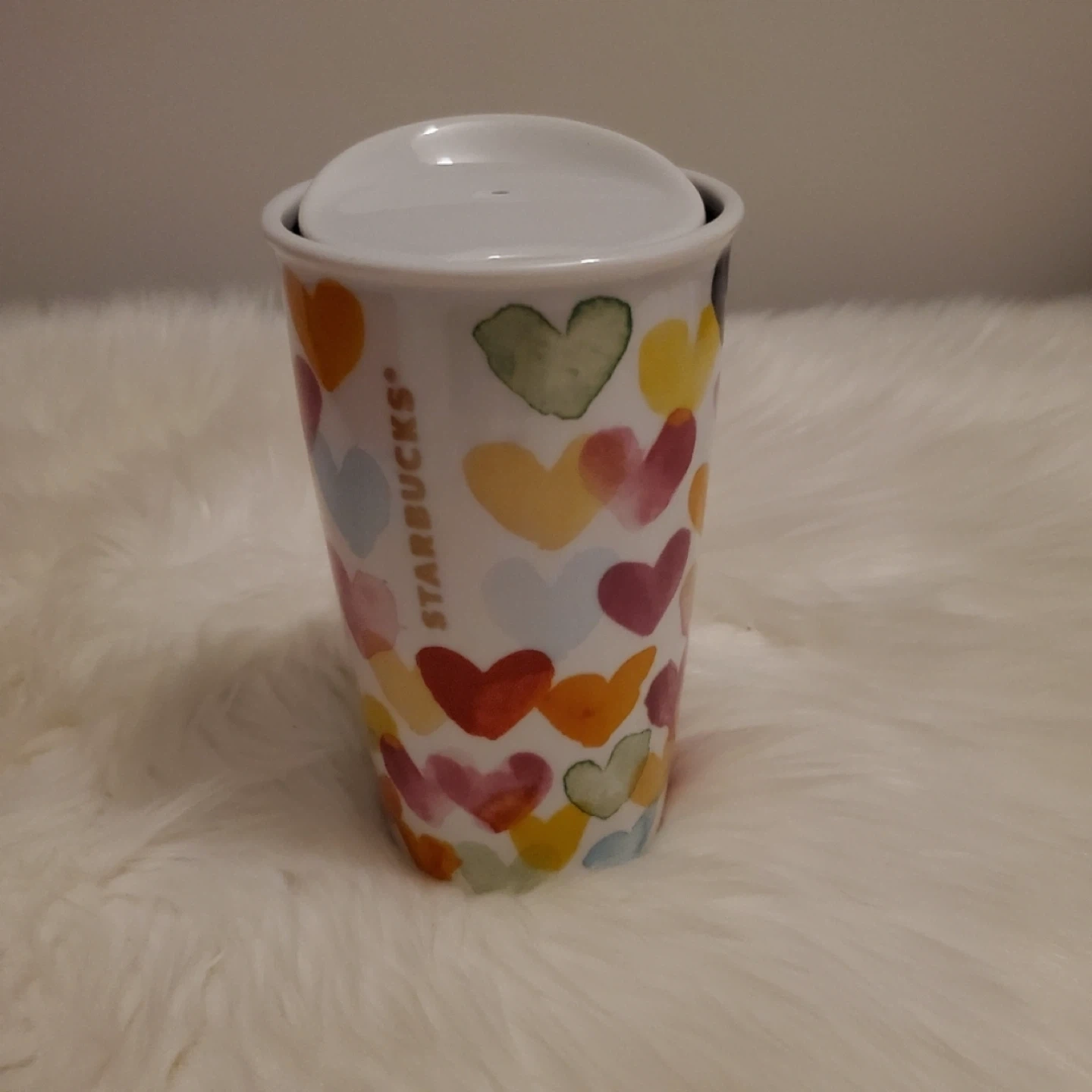 A cute Starbucks travel mug featuring a colourful heart design! It holds 10 fl oz / 296ml. The mug comes with a lid and its original box. Originally retailed for $21.95 in Canada Pick up: Suntea on Kingsway Royal Oak skytrain station Metrotown Mall