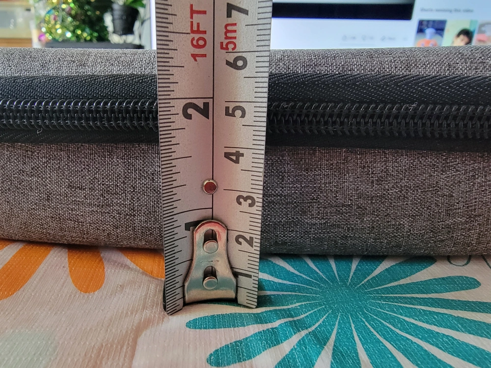 Here's a grey carrying case by apoca. It's in great shape and ready for a new home! The inside has a mesh pocket and an elastic strap to keep your items secure. The dimensions are approximately 8 inches long and 3.5 inches wide
