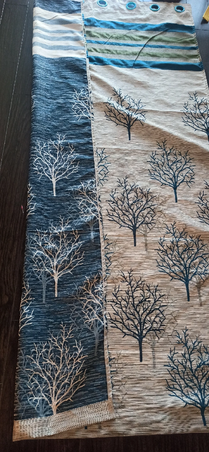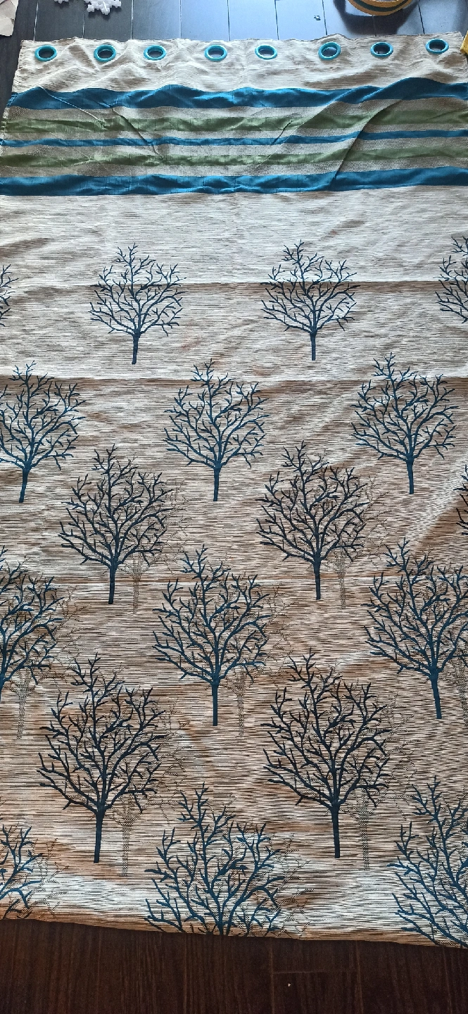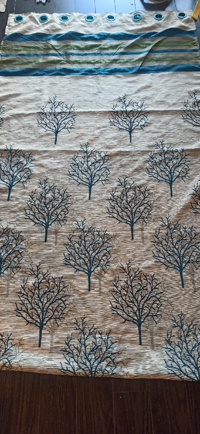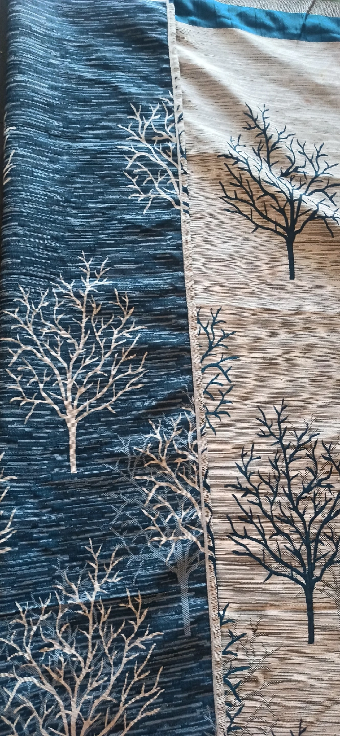 86Selling a curtain panels featuring a lovely tree print. two way panel has blue trees on a beige background, while the other has white trees on a dark blue background. They're in great condition and ready to add a touch of nature to your home! around 85inch length curtain