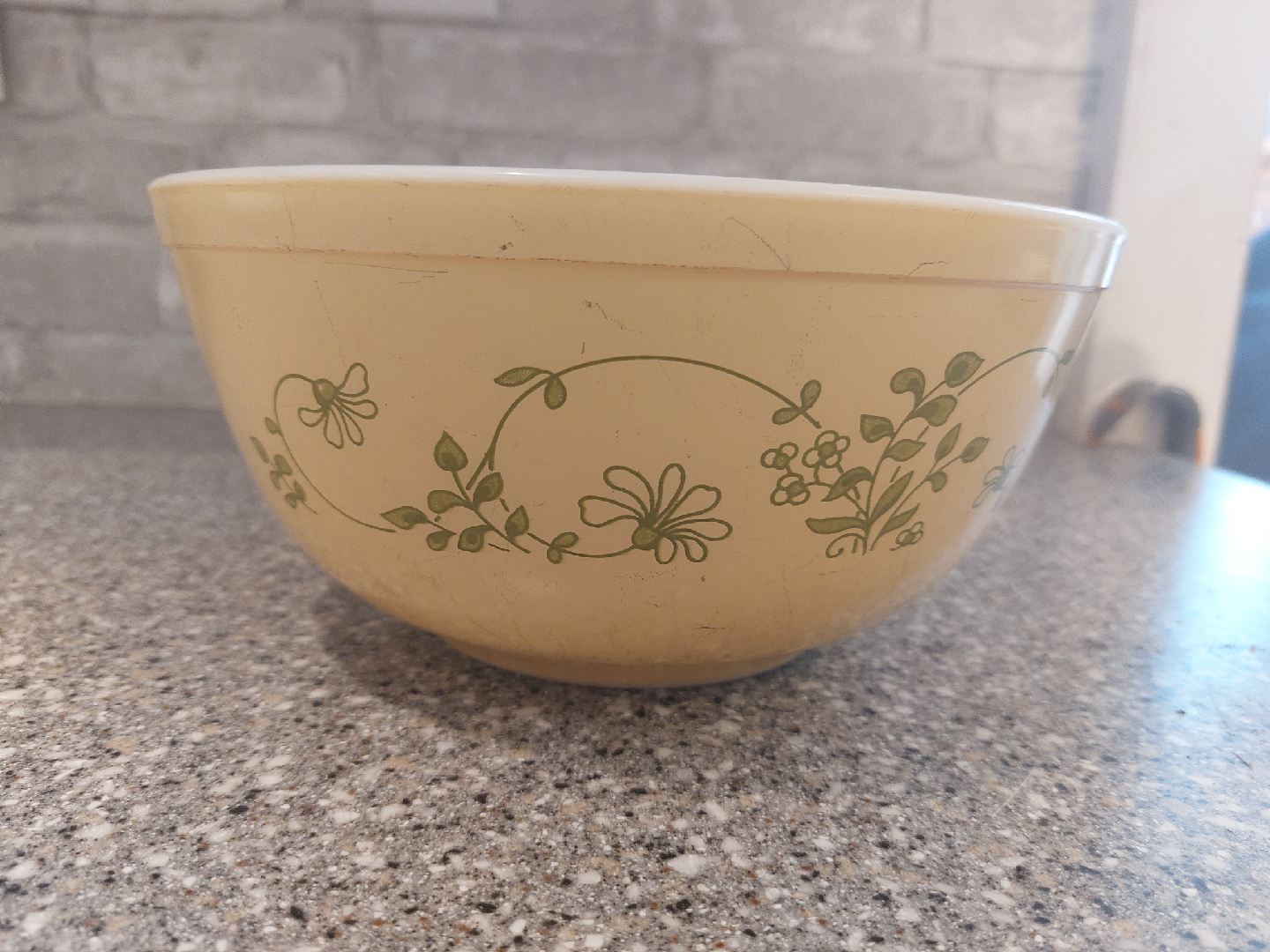 Selling a set of vintage Pyrex Shenandoah mixing bowls! They are a lovely light yellow colour with a delicate floral leaf pattern. There are some signs of wear and scratches, as shown in the photos, no crackling noted on the inside of the bowels, but they're still in good condition for their age.