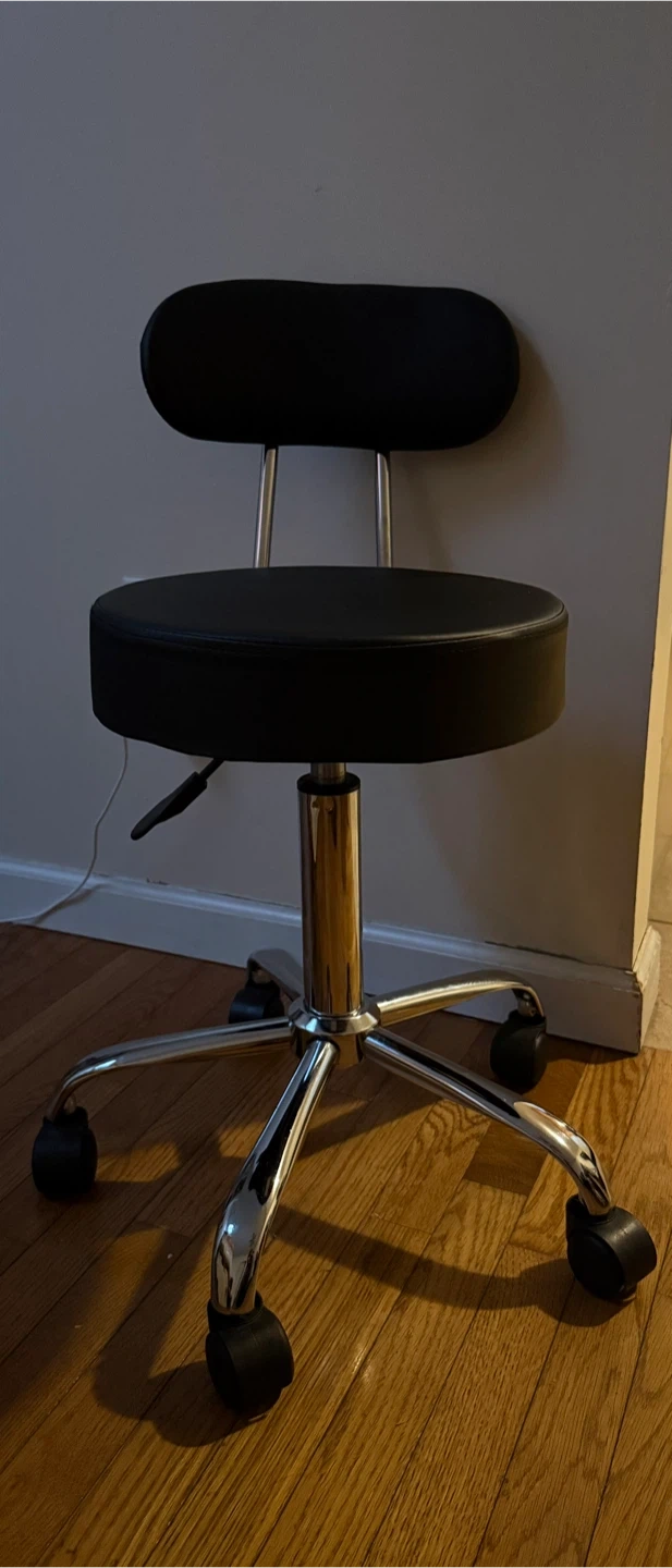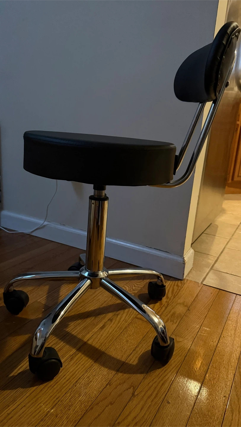 Selling a comfortable rolling swivel stool chair! It features a black seat and a chrome base.