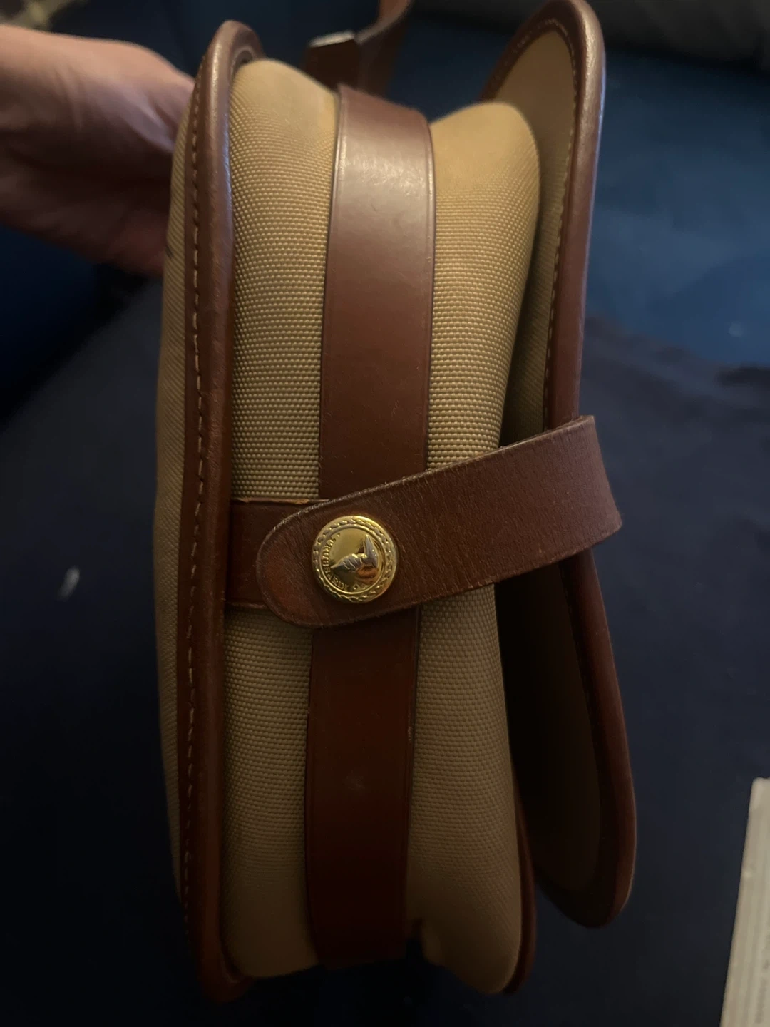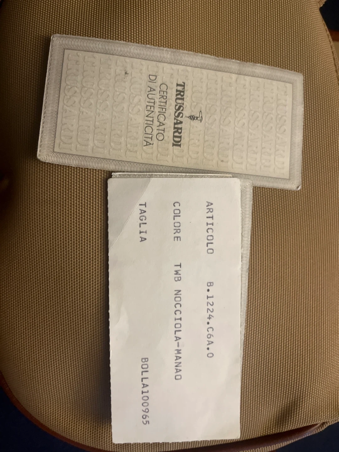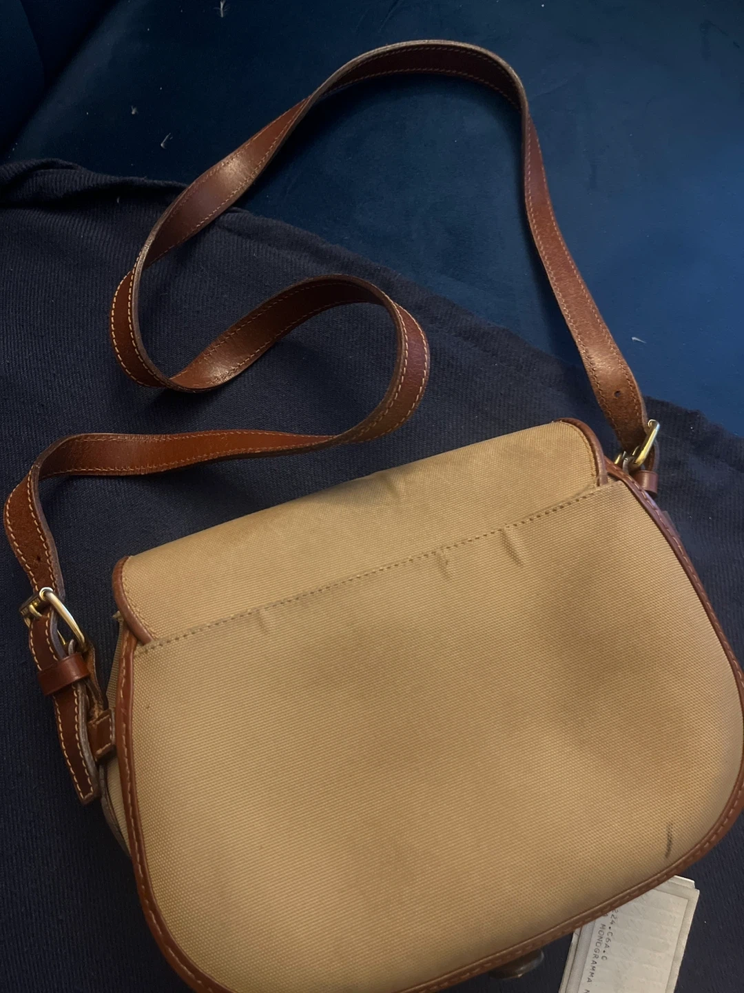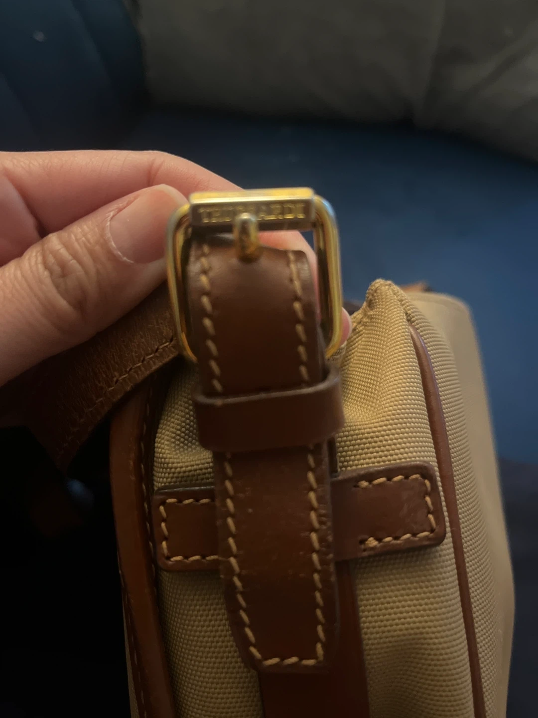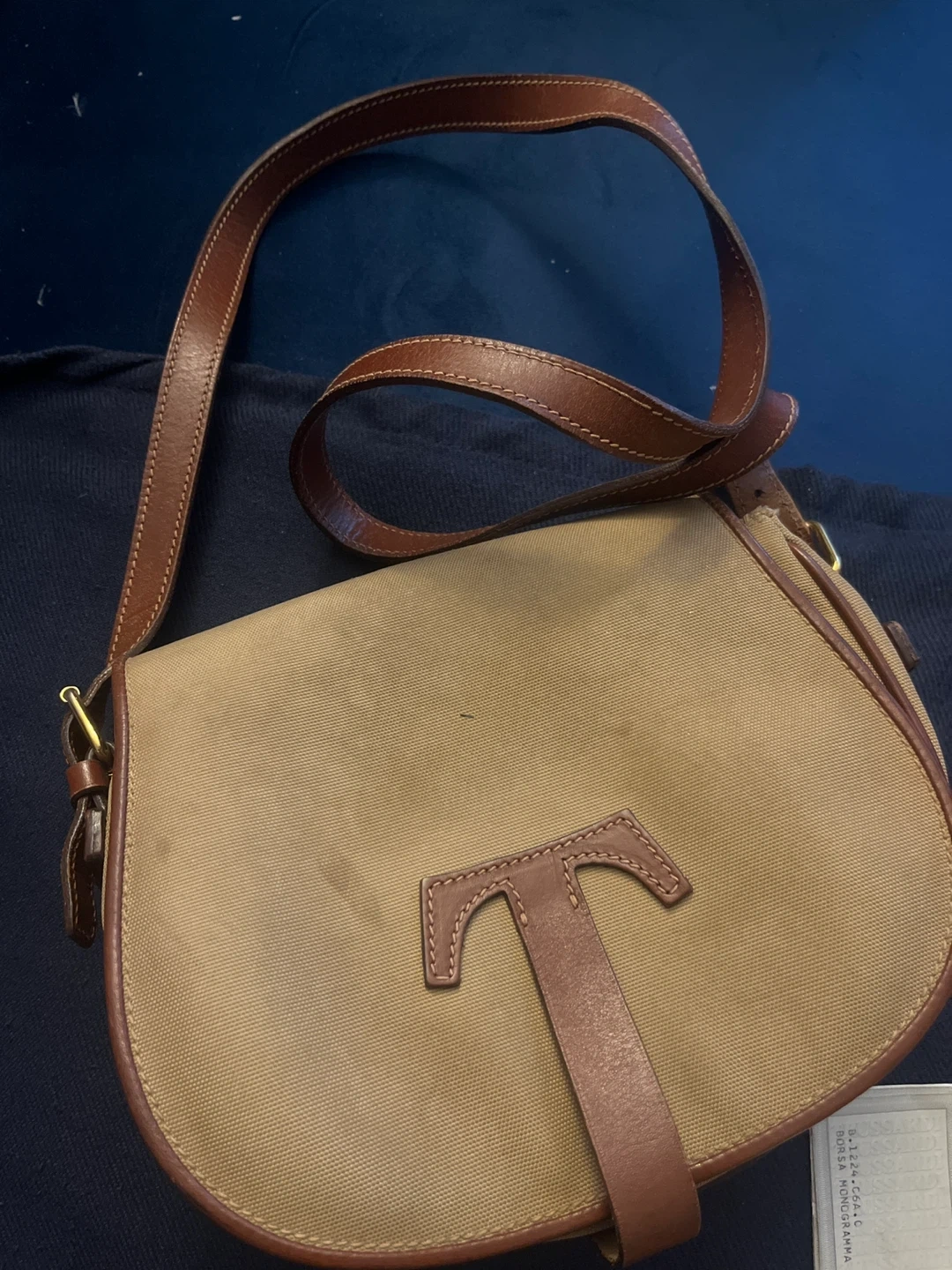Selling a Trussardi shoulder bag in beige canvas with brown leather trim. It features the Trussardi T' logo on the front. The bag has a classic saddle shape and a comfortable shoulder strap. Perfect for everyday use! With authenticity card!