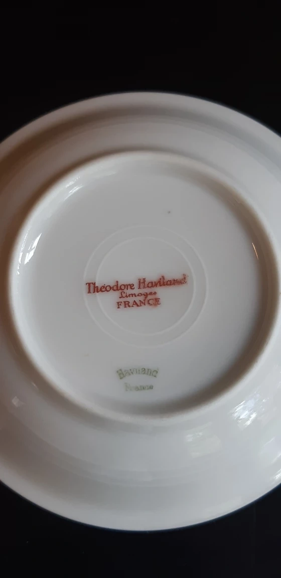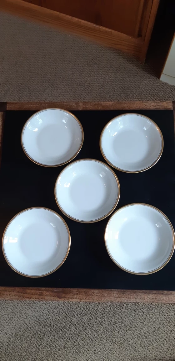 828Set of five Theodore Haviland plates from Limoges, France They're white with a gold trim and in great condition. Perfect for adding a touch of elegance to your table!