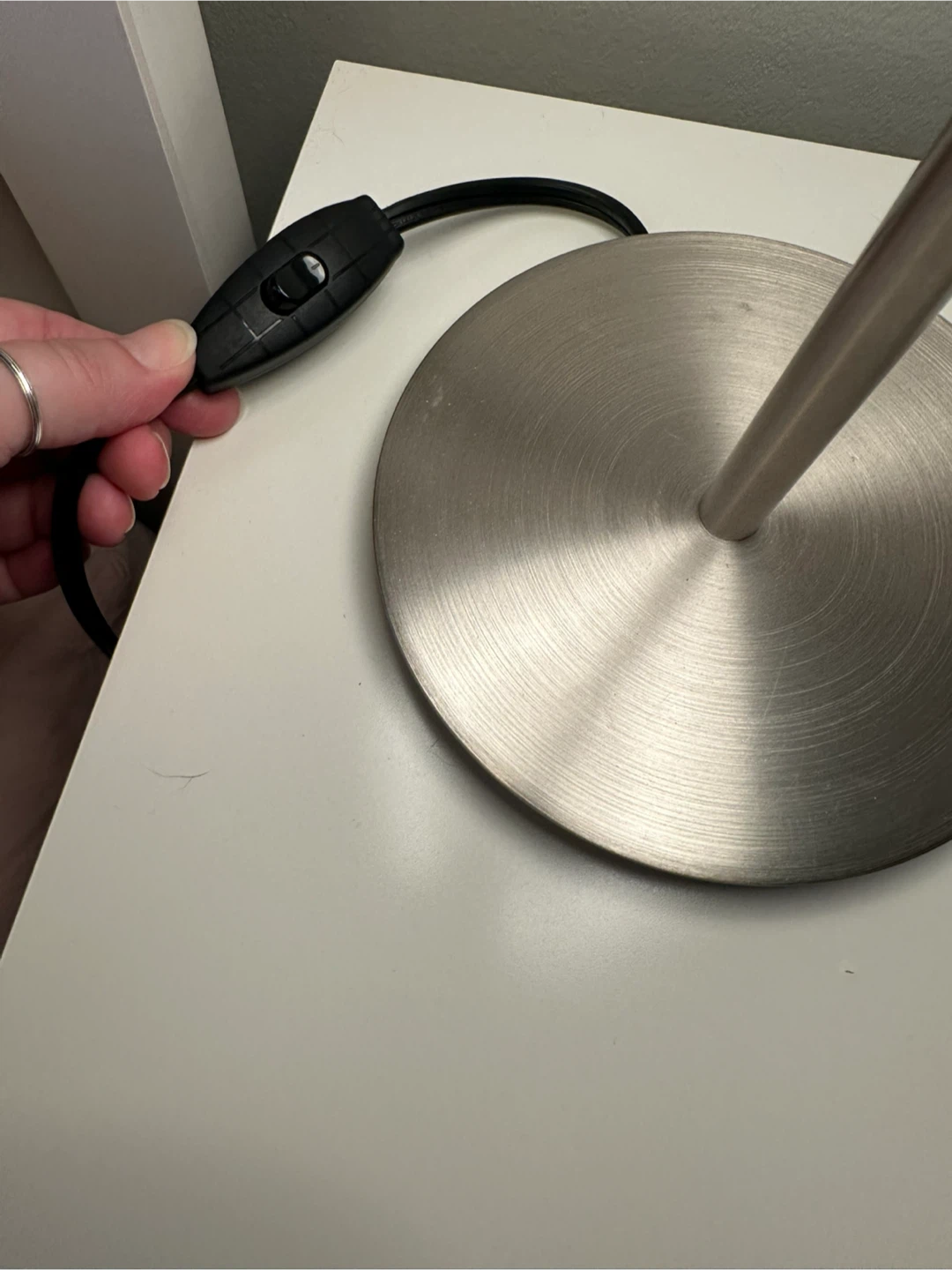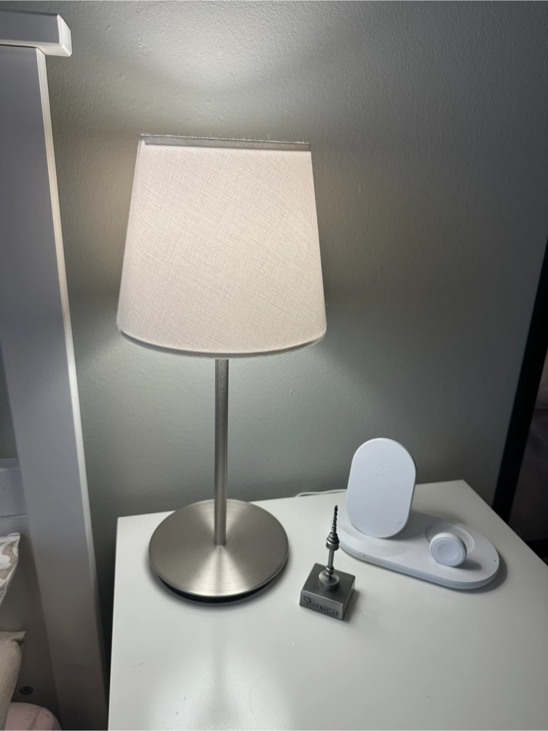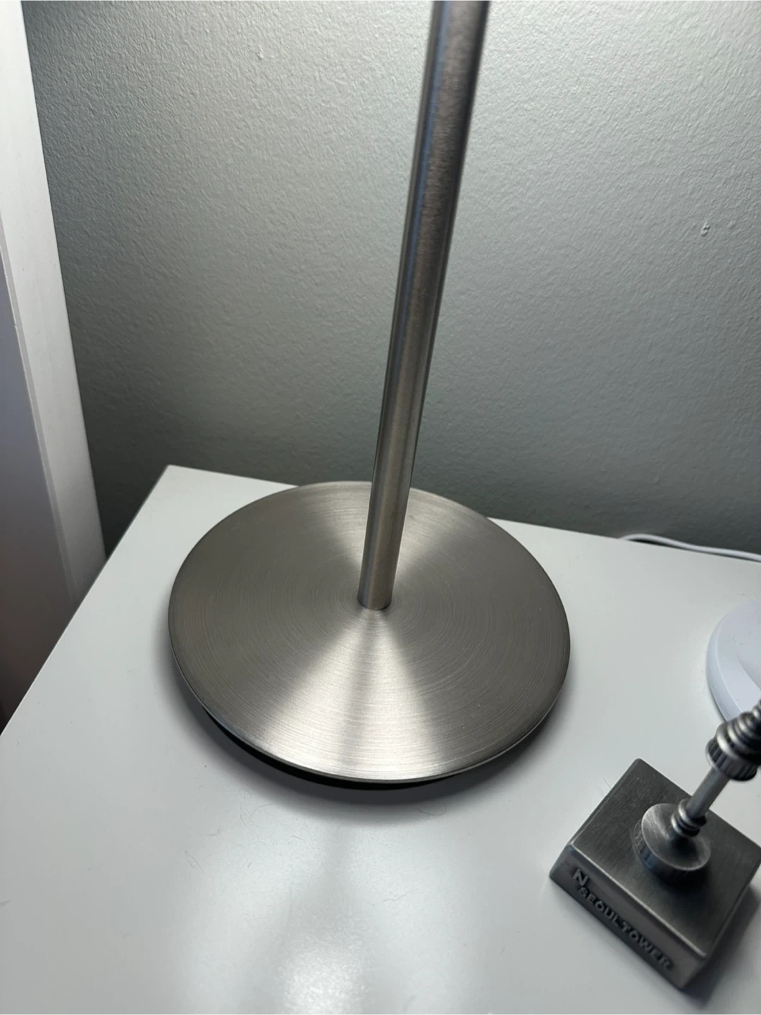 Selling a desk lamp with a silver base and a white shade. It's in great condition and would be perfect for a bedside table or desk. The lamp has a simple on/off switch on the cord. It provides a nice, soft light for reading or working.