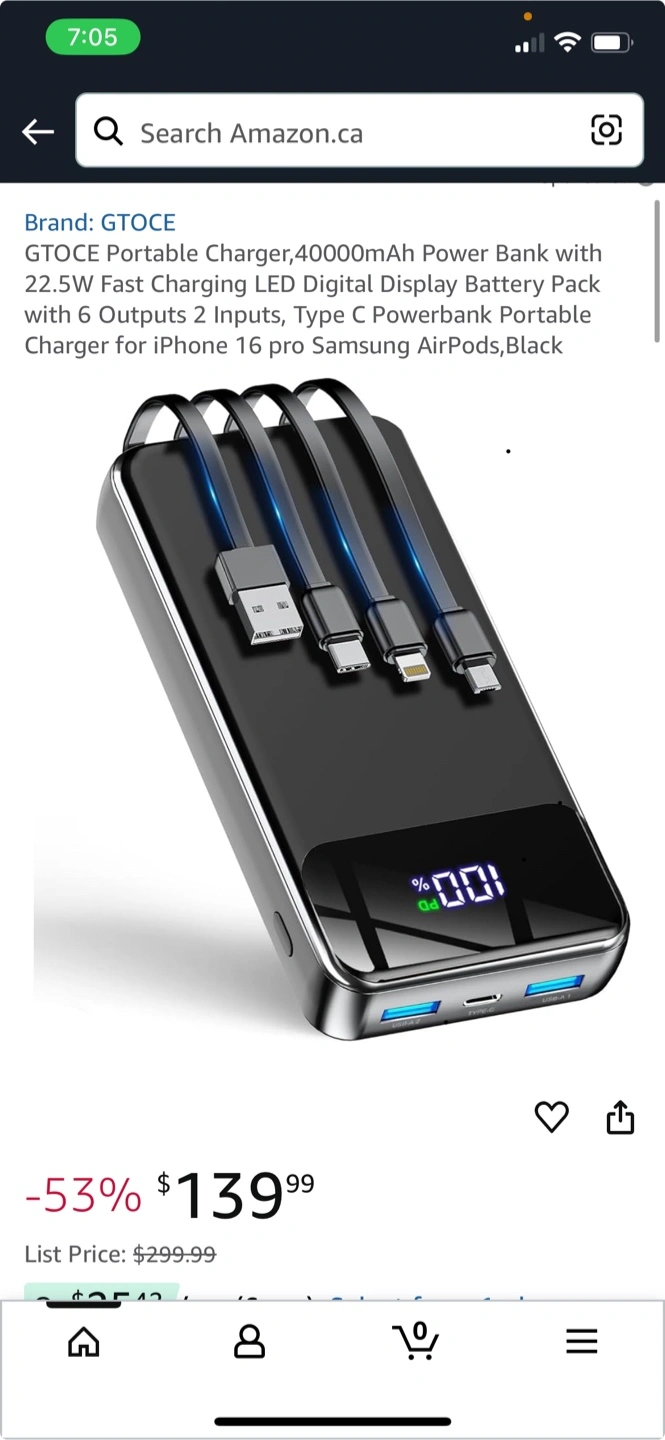 This Gtoce portable charger has a large 40000mAh capacity. It features 6 outputs and 2 inputs, with 22.5W super fast charging. It also has an LED digital display. It's compact and easy to carry!