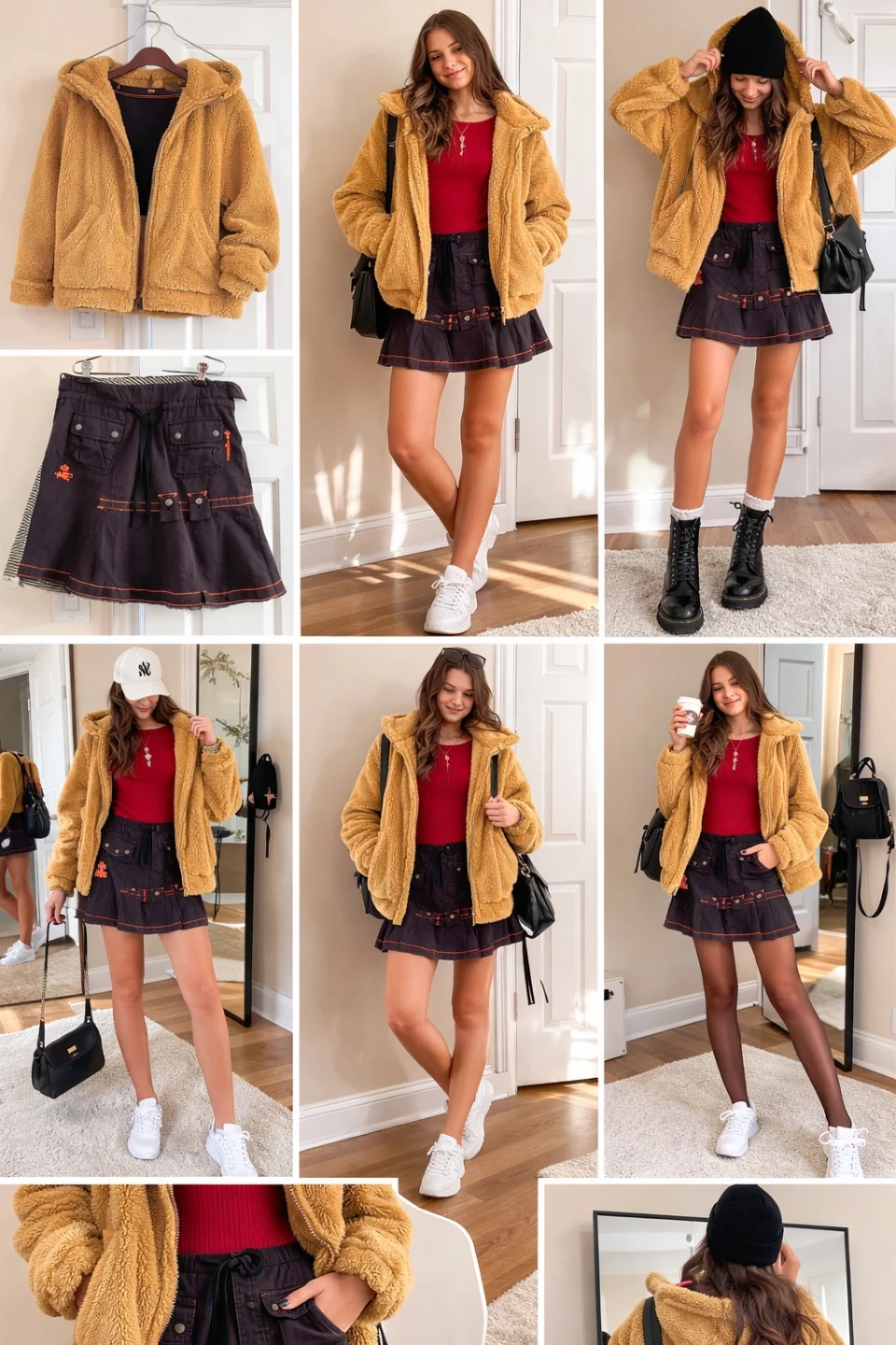 Diesel's black skirt with orange detailing, drawstring, and pockets, paired with a Sherpa coat and red sweater, boots (size 7) and hat is perfect for a casual student look! π€π§‘π§₯ #Diesel #Skirt #Coat #Sweater #Pockets #Drawstring #Fashion #Style #Student