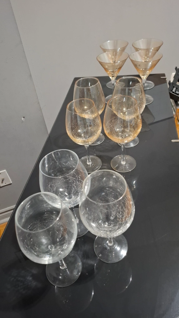 Selling a set of 11 assorted wine glasses. There are various shapes and styles, perfect for different types of wine or cocktails. They'd be a great addition to any home bar or kitchen!