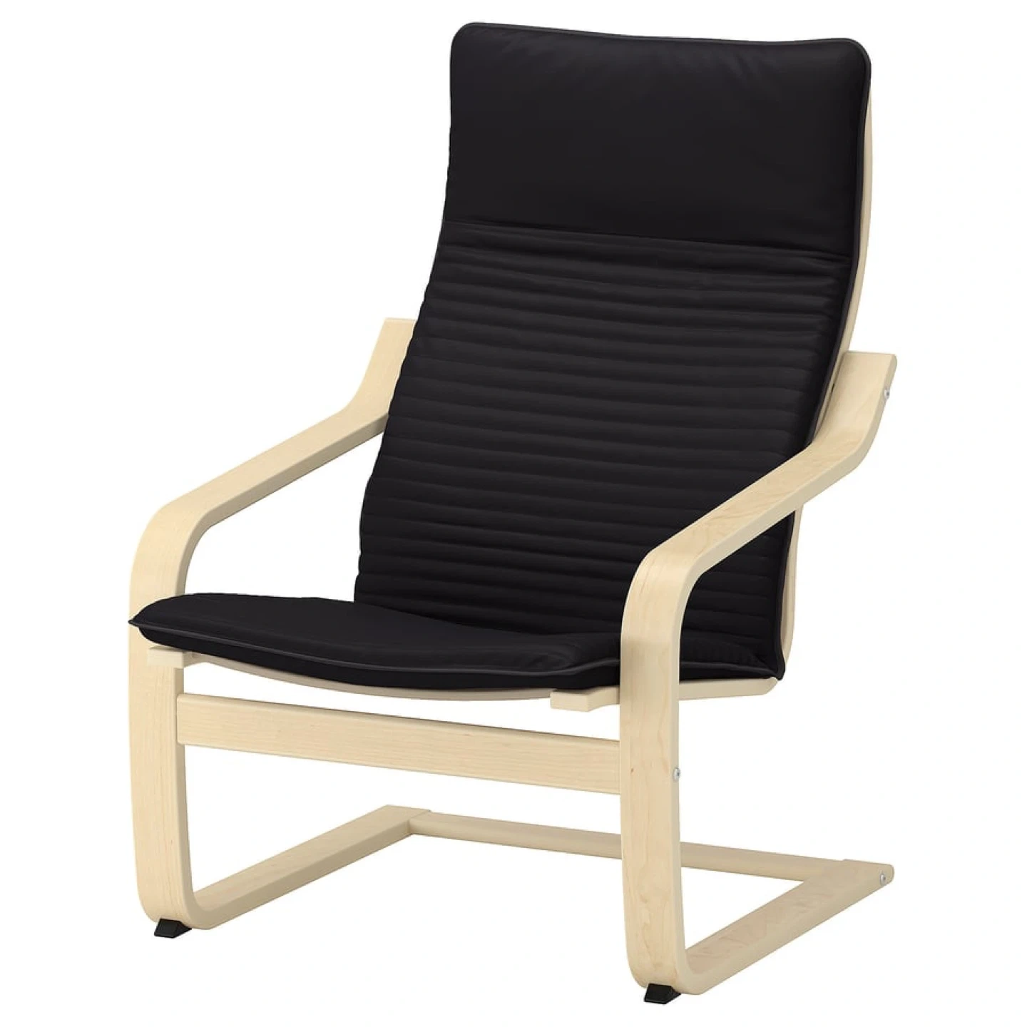 Selling a comfy IKEA Poang chair! It features a black cushion and a light wood. Perfect for relaxing! It detaches for washing!!