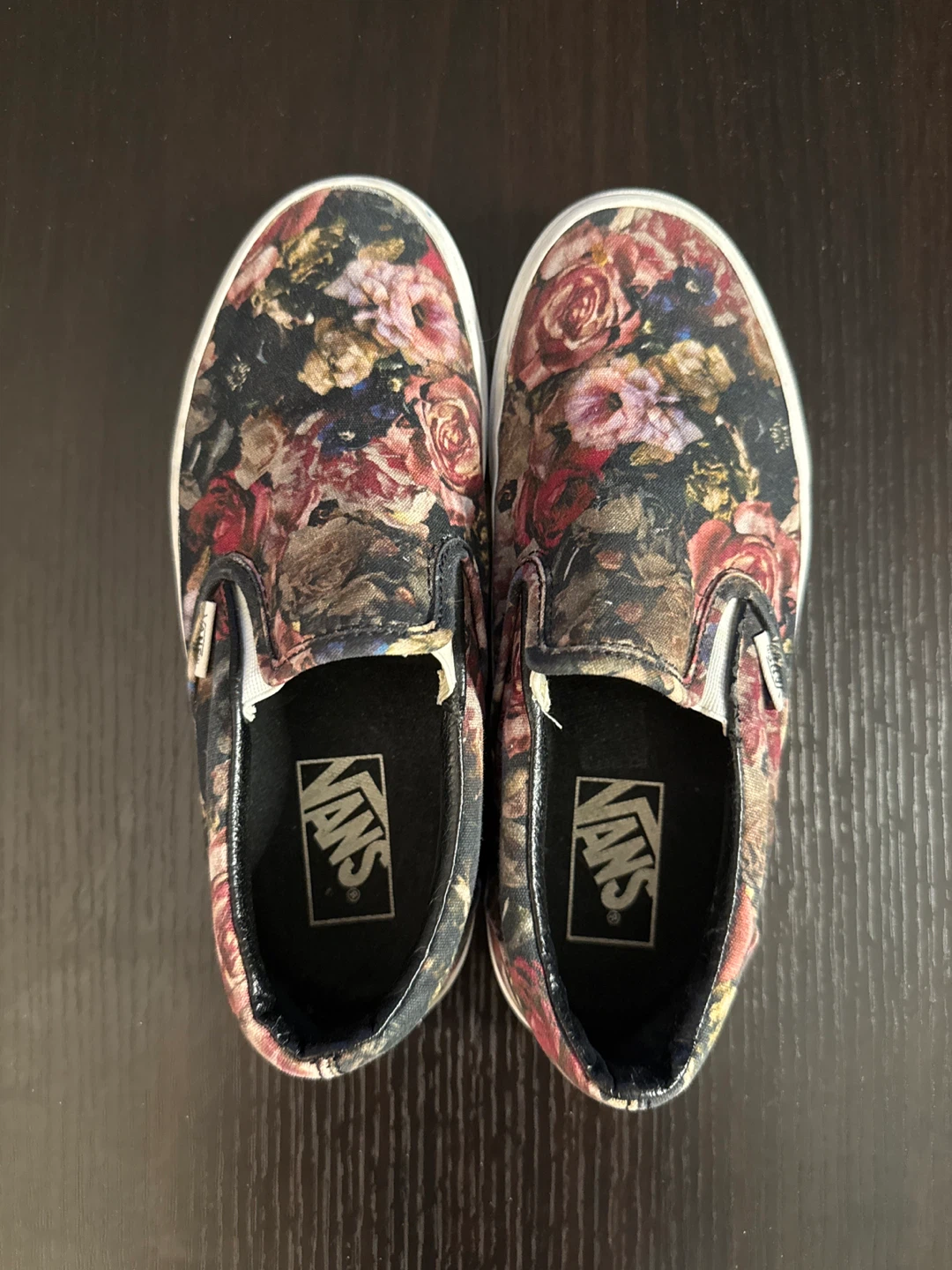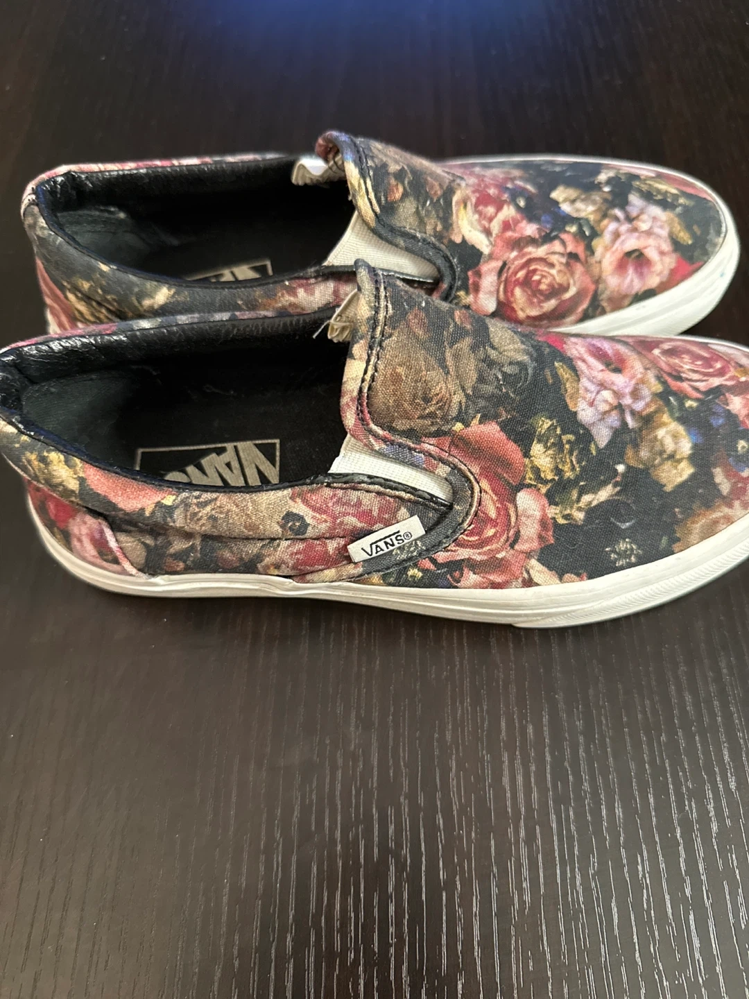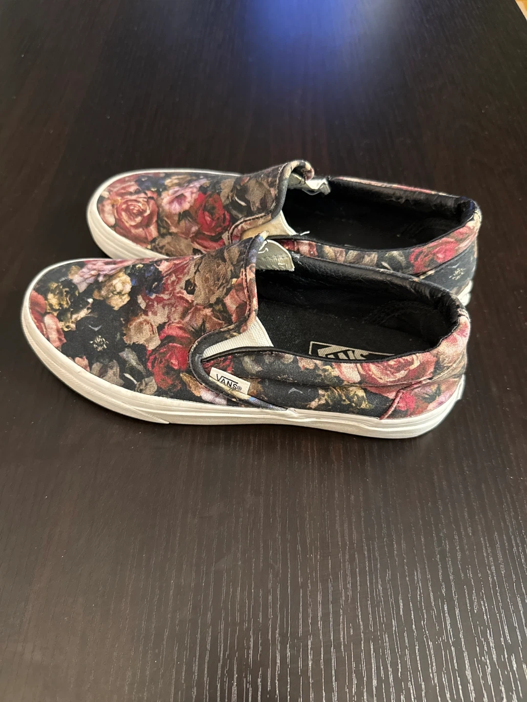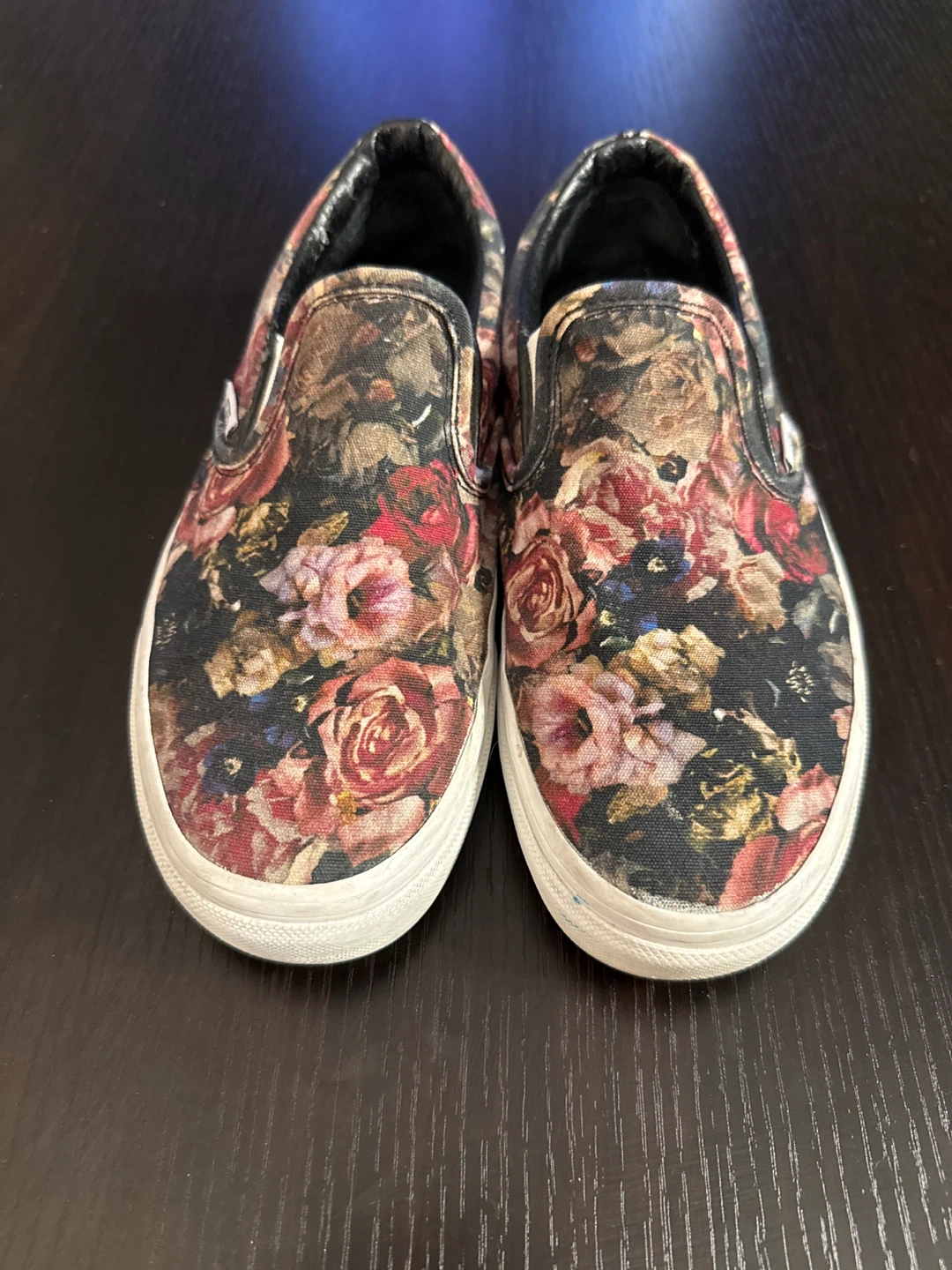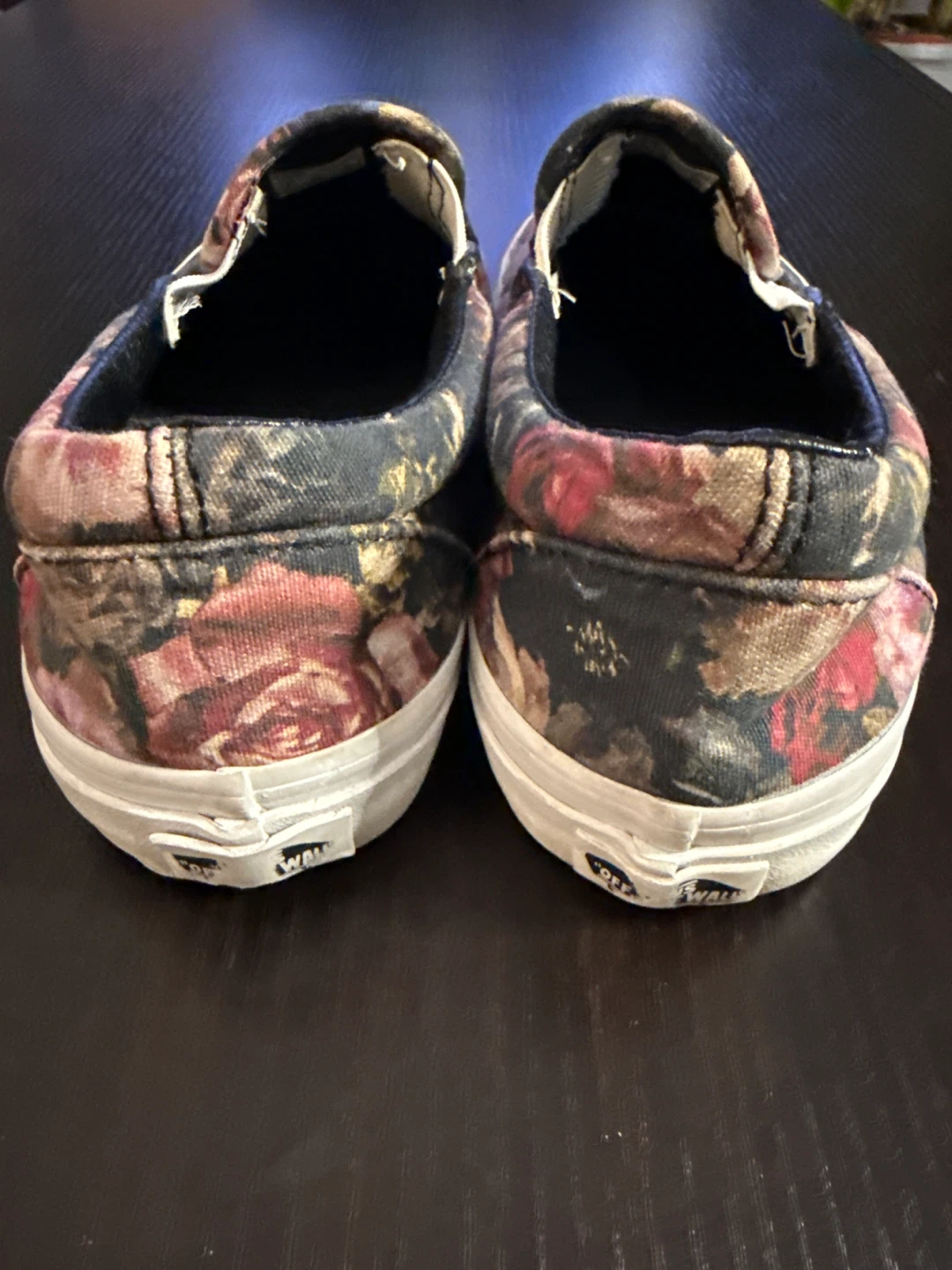 These are a pair of Vans slip-on shoes with a floral pattern. They're in good used condition and ready for a new home! They are in size 6.5 US. The floral design features roses and other flowers in shades of red, pink, and black.