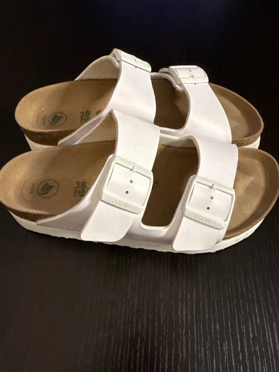 Selling a pair of Papillio by Birkenstock sandals in size 38 (US 7). They're white and in great shape! The footbed is vegan, and they're super comfy for everyday wear