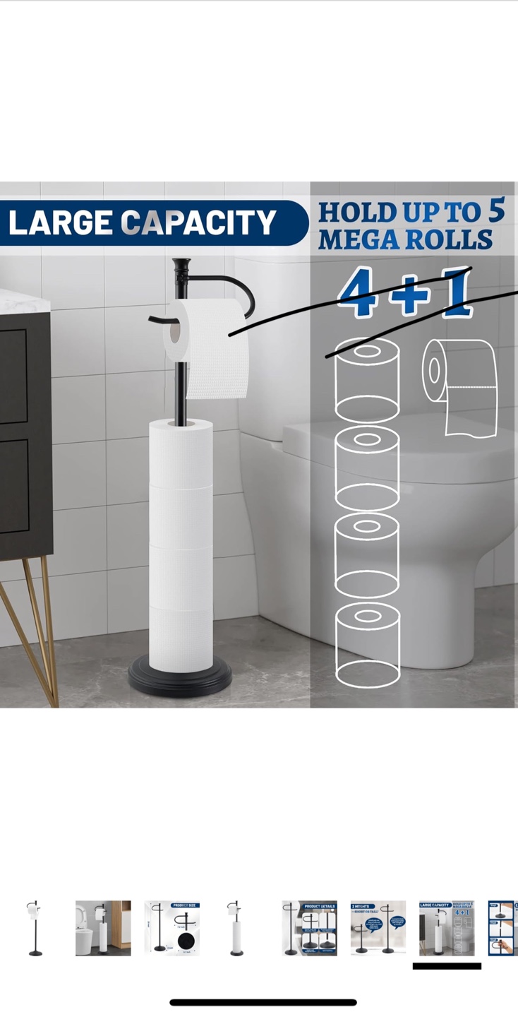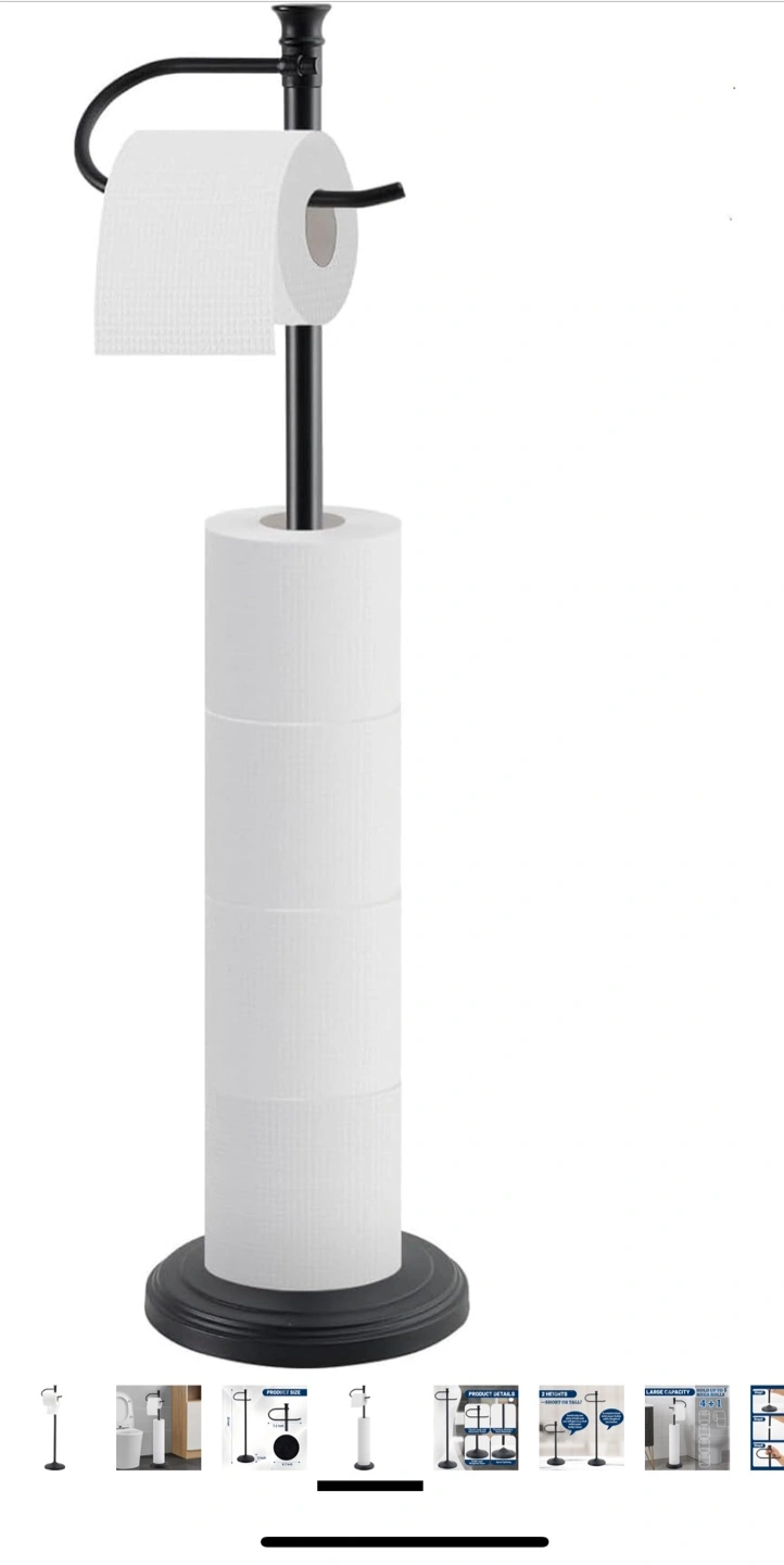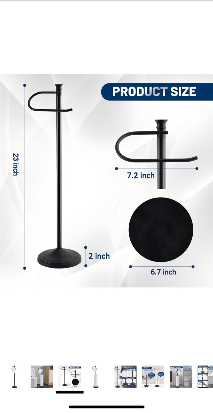 This is a SANGFOR toilet paper holder stand. It's black and has a large storage capacity for toilet paper rolls. The stand is stable with a heavy base and is rustproof. It's about 23 inches tall, the paper holder is 7.2 inches wide, and the base is 6.7 inches in diameter