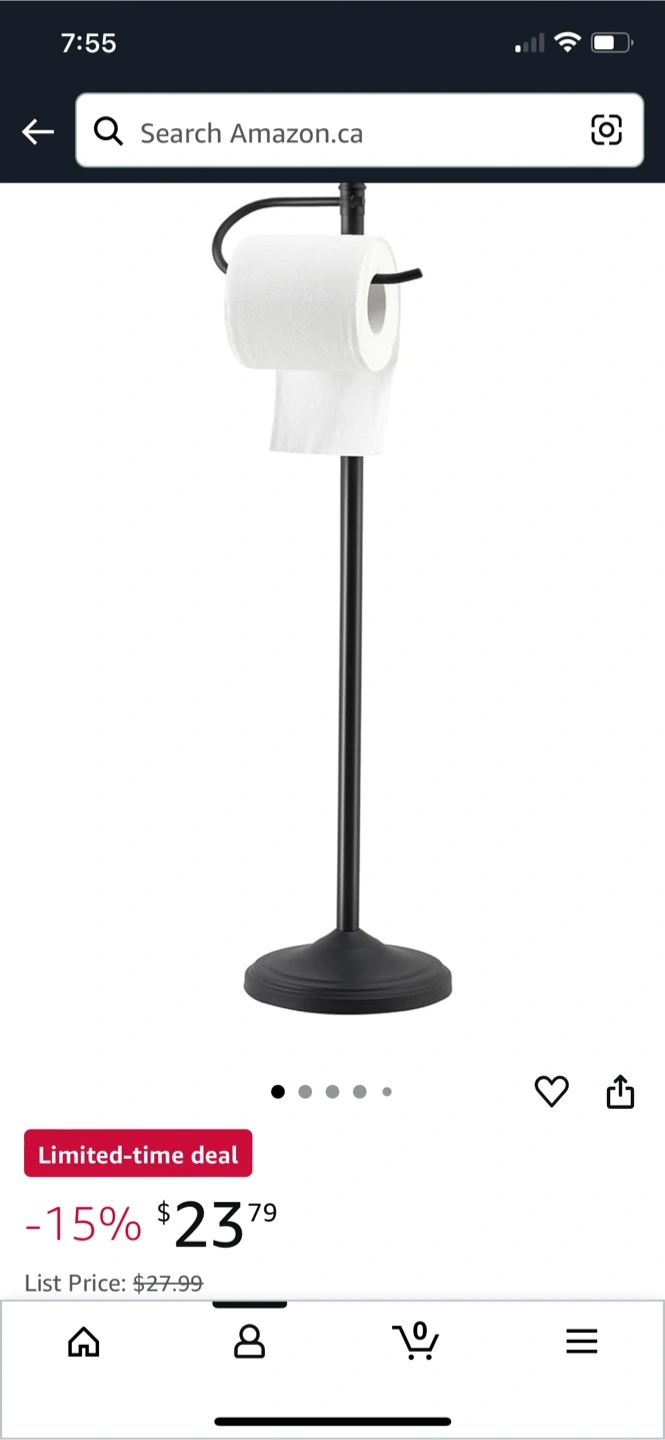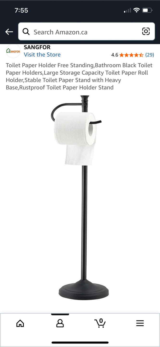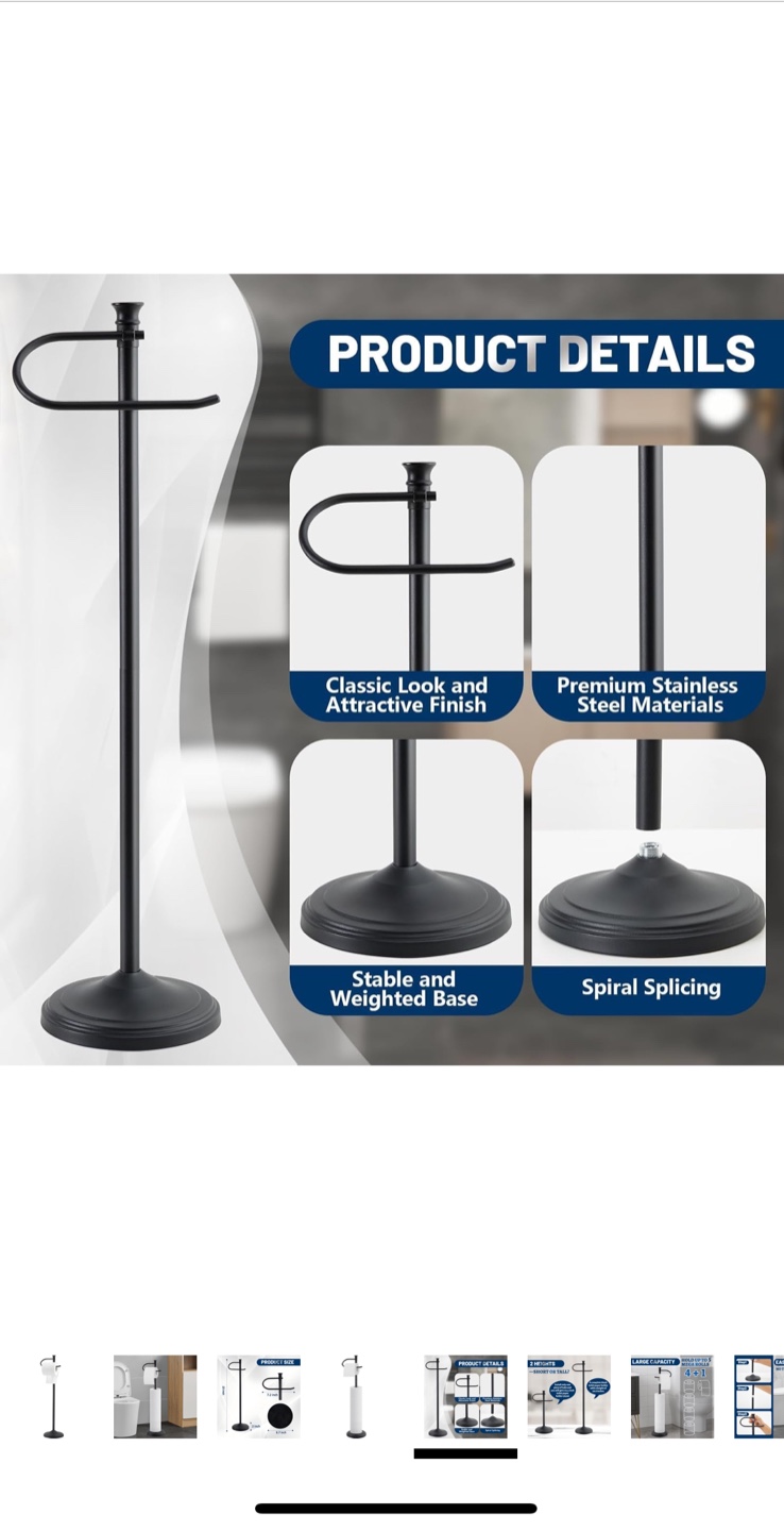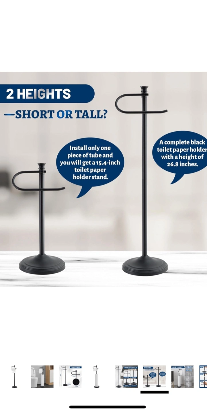 This is a SANGFOR toilet paper holder stand. It's black and has a large storage capacity for toilet paper rolls. The stand is stable with a heavy base and is rustproof. It's about 23 inches tall, the paper holder is 7.2 inches wide, and the base is 6.7 inches in diameter