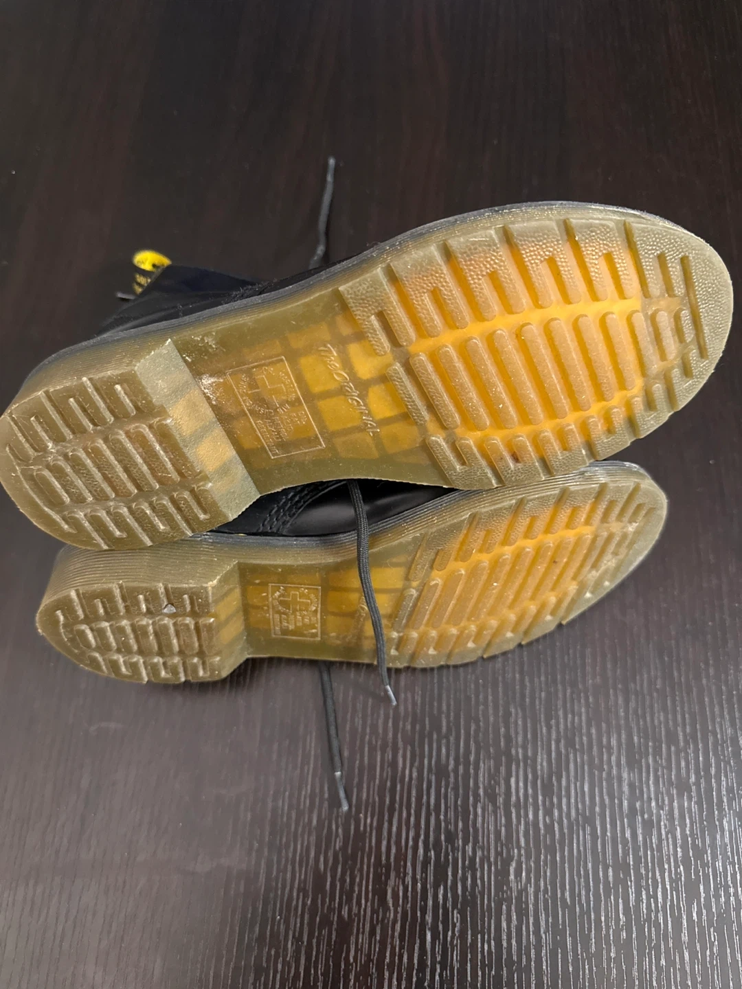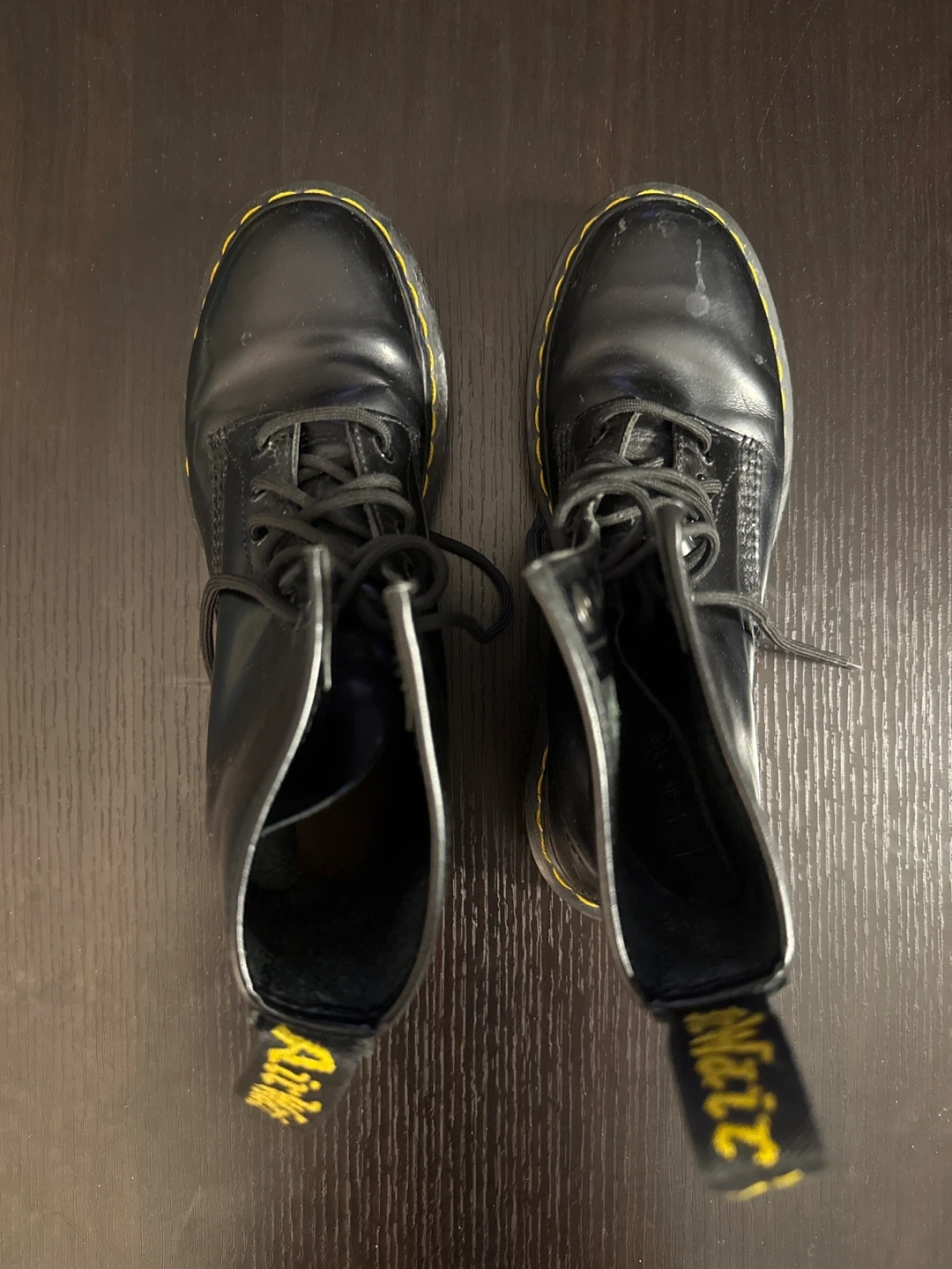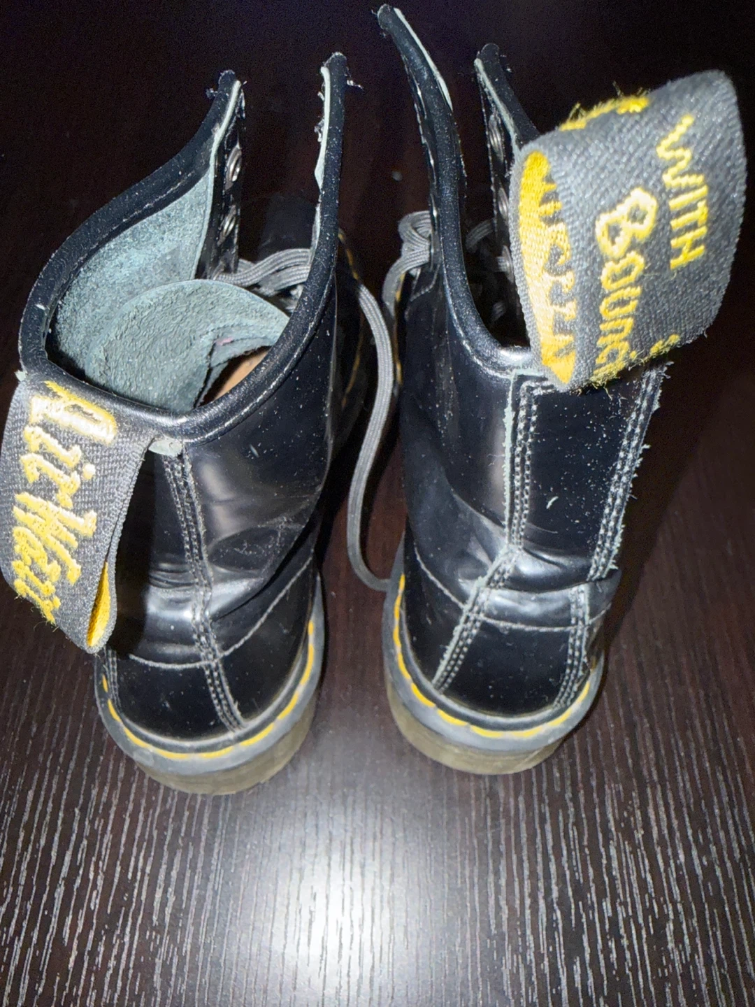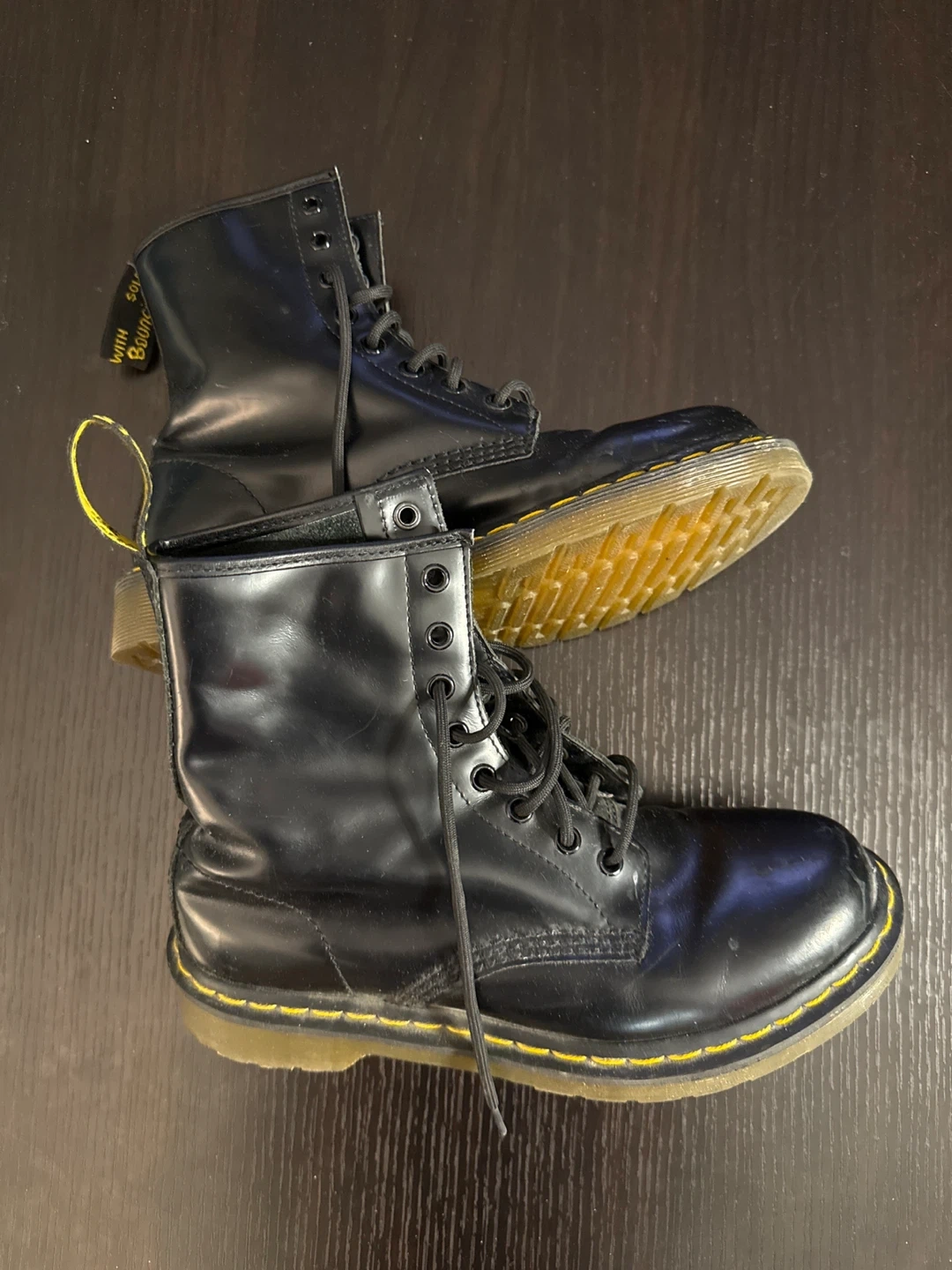 Selling a pair of Dr. Martens 1460 boots in black leather. These classic boots have the iconic yellow stitching and 'Bouncing Soles'. They show some signs of wear but have lots of life left in them!