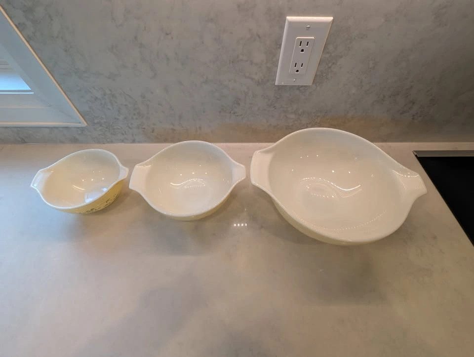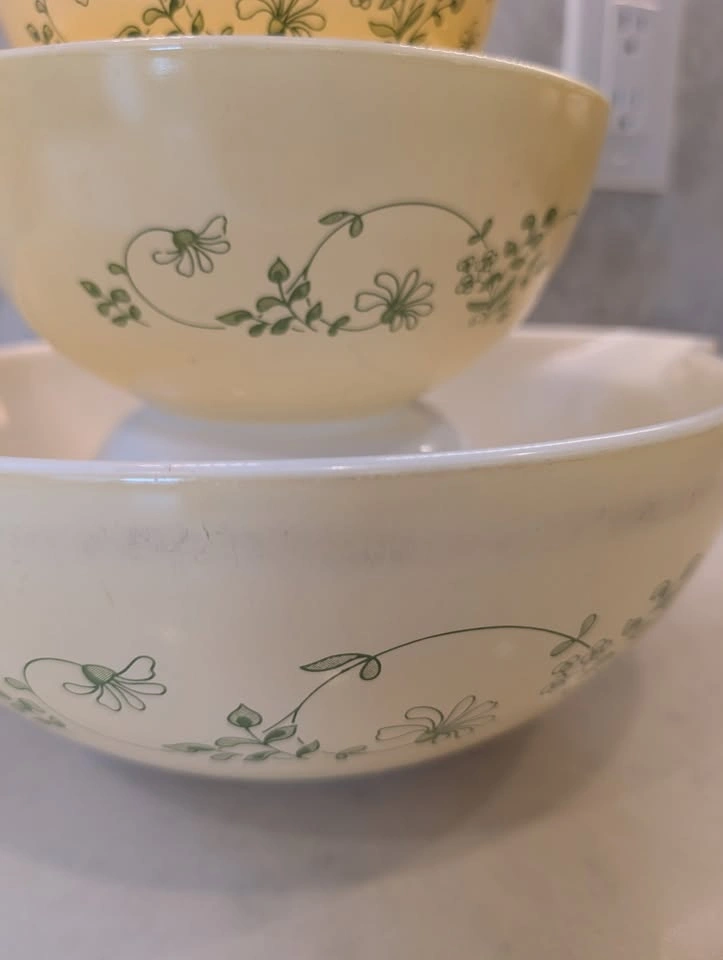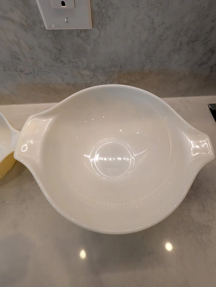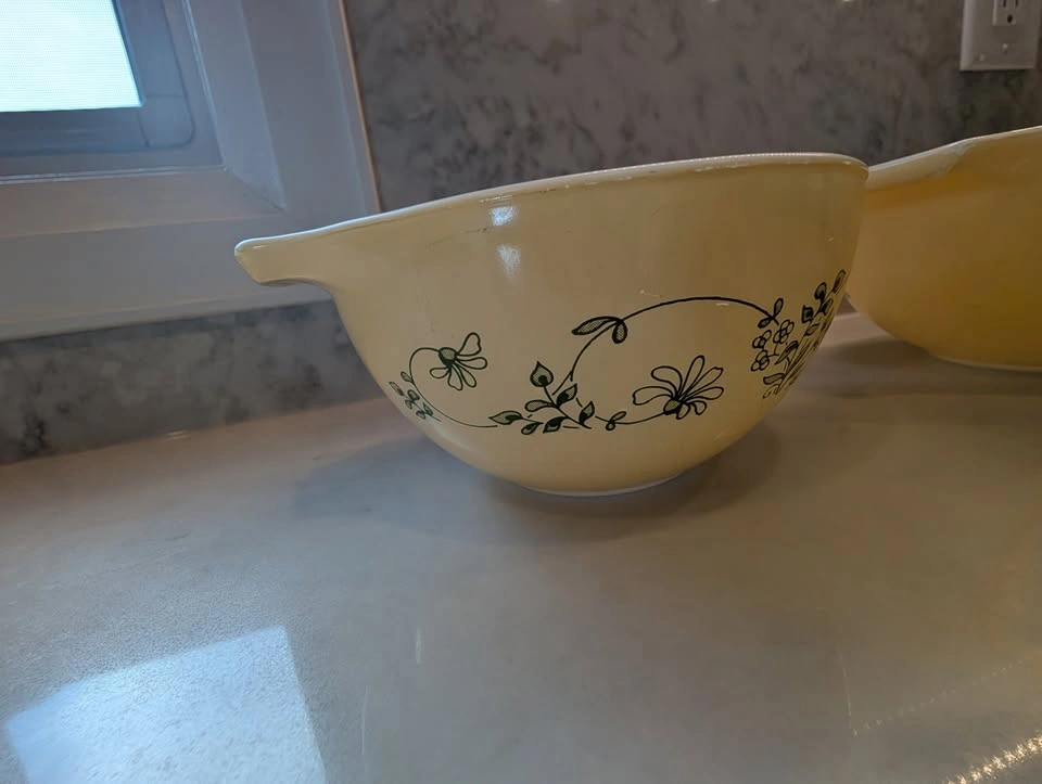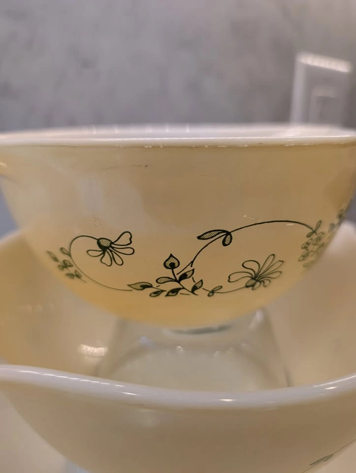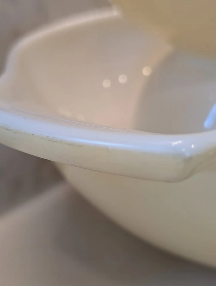52Please note: there's greey marks and wear to the inside and outside of the bowls, including chips to the paint on the handles.