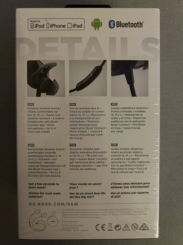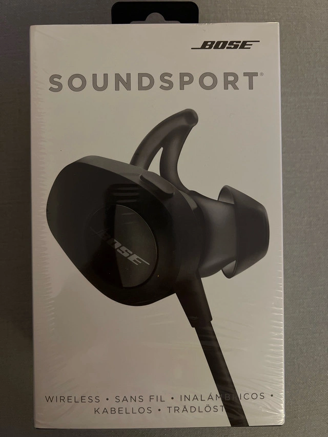 Selling a pair of new, sealed Bose Soundsport wireless headphones in black, offering dynamic wireless sound with comfortable earbuds, sweat and weather resistance, and an inline microphone for calls with up to 6 hours of battery life per charge. Key Features: * Dynamic wireless sound * Sweat and weather resistant * Inline microphone * Up to 6 hours of battery per charge If the ad is up, they're available!