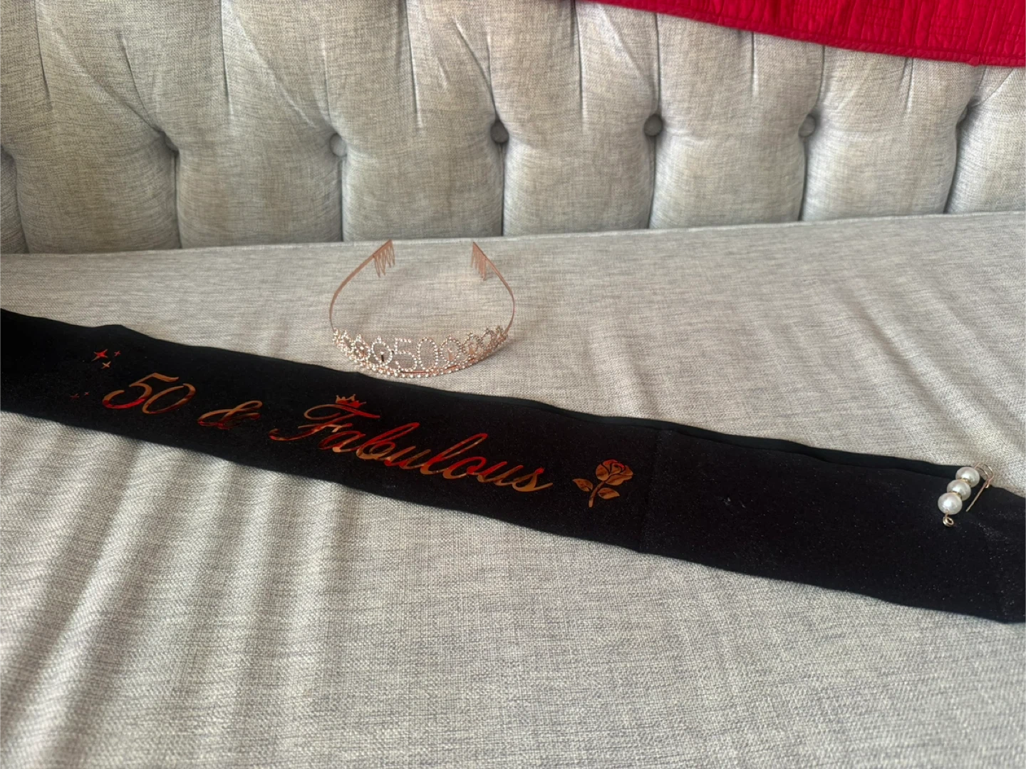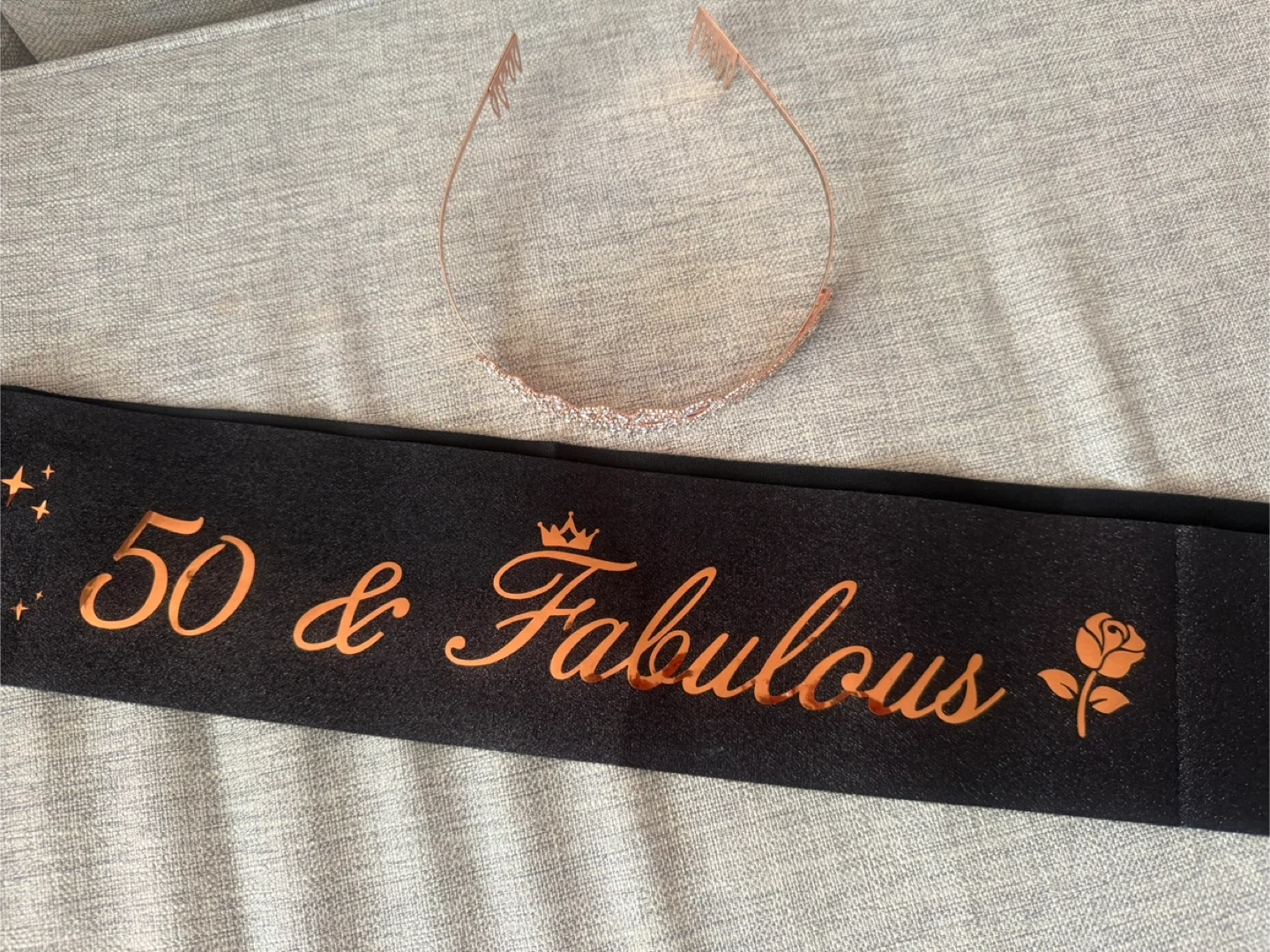 80Celebrating a milestone? I have a '50 & Fabulous' birthday sash and tiara set! The sash is black with red and gold lettering, and the tiara is a lovely rose gold colour. Perfect for a 50th birthday celebration