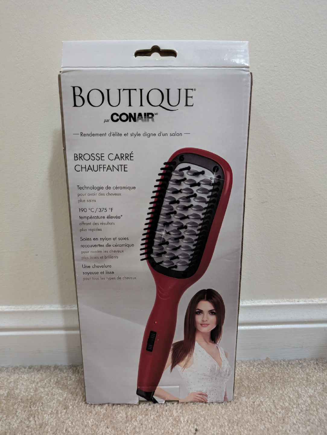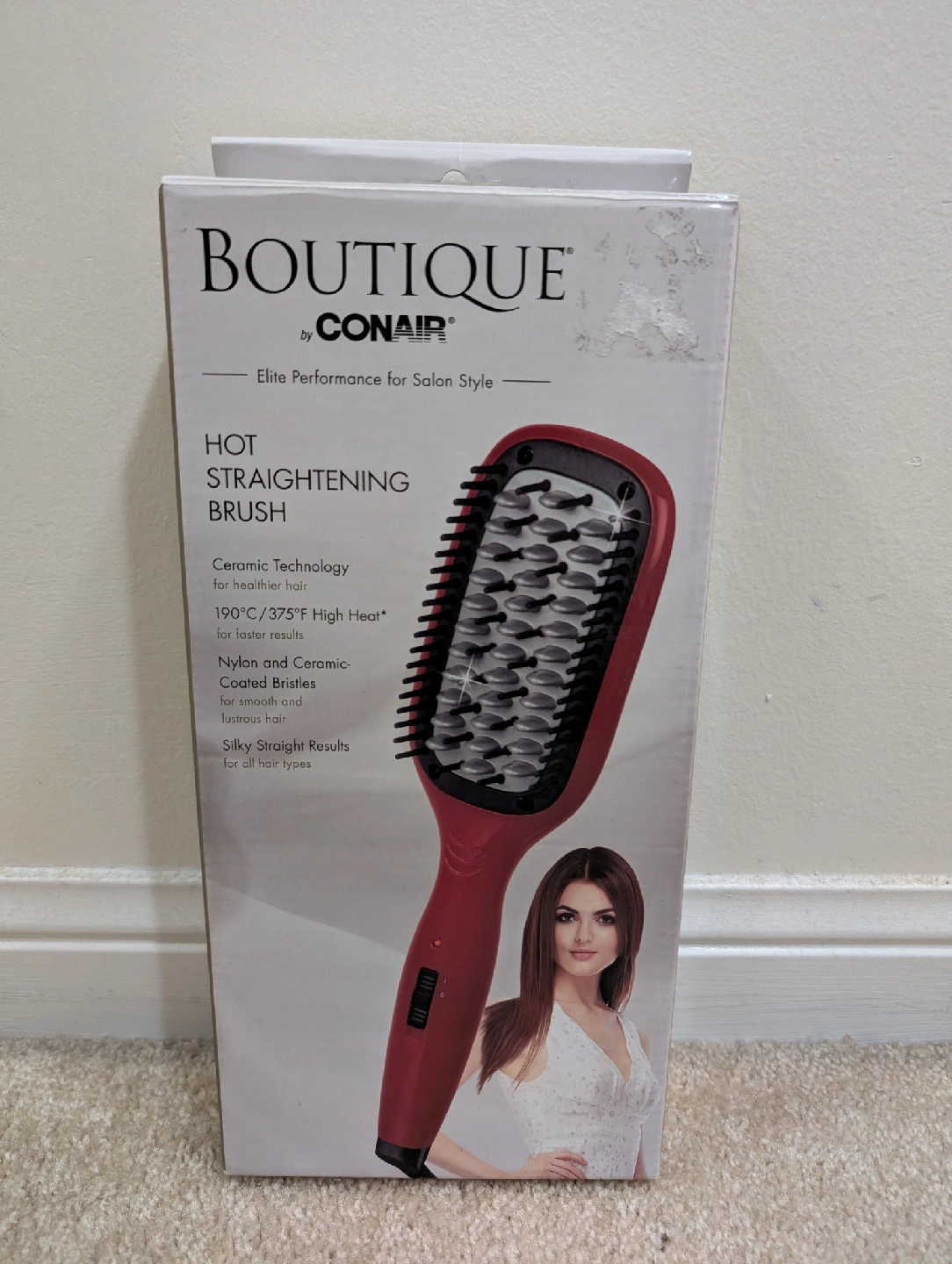 Selling a Boutique by Conair hot straightening brush. It features ceramic technology for healthier hair and heats up to 190°C / 375°F. The bristles are nylon and ceramic-coated, promising silky straight results for all hair types. The box is included!
