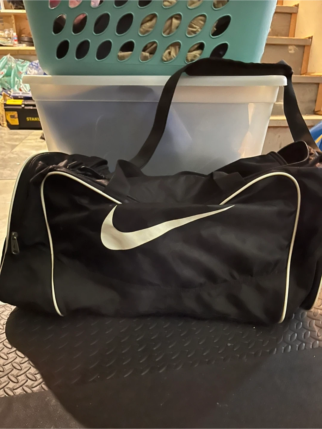 87Selling a Nike duffle bag! It's black with the iconic white swoosh logo. Perfect for the gym or weekend trips