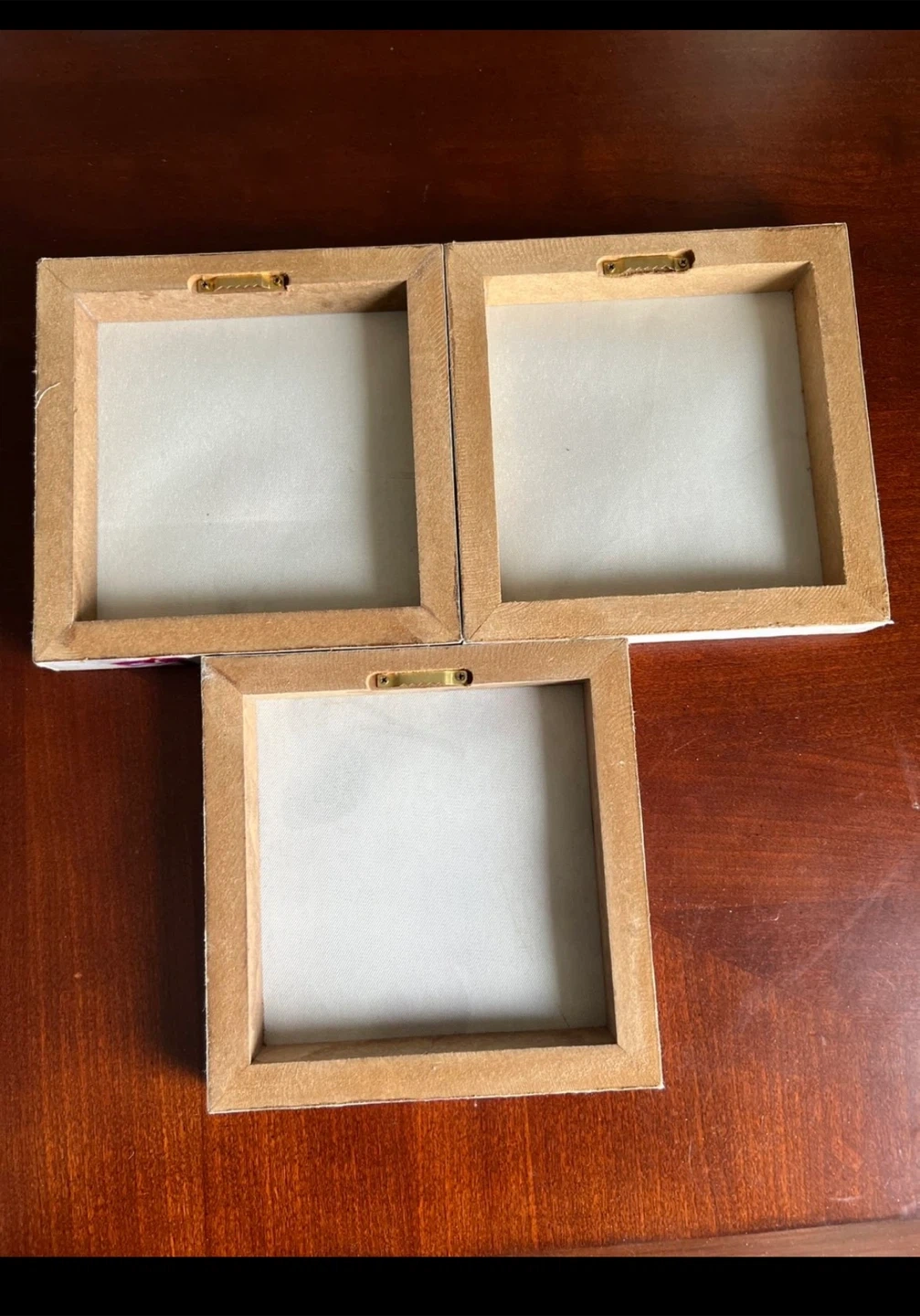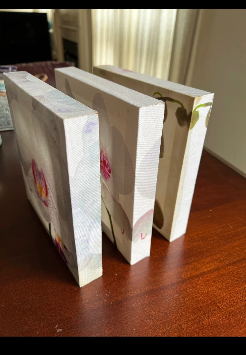 143Three small square pieces of wall art. White flower. 8 inches in height and width each.