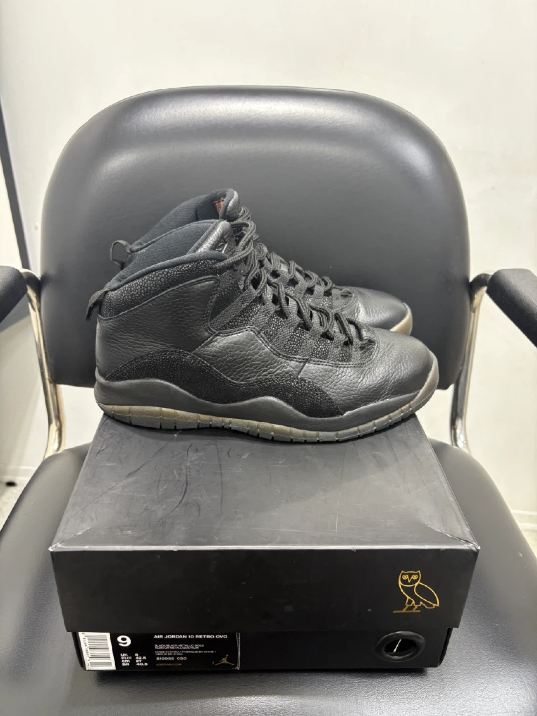 Selling a pair of Air Jordan 10 Retro OVO in black. These are a size 9. They come with the original box, complete with the OVO owl logo. Great for any sneaker collector or fan of the brand!