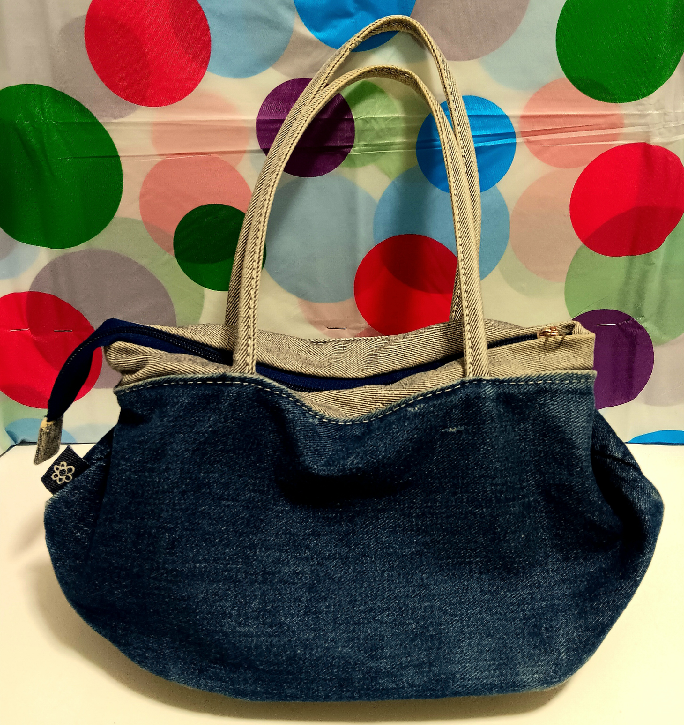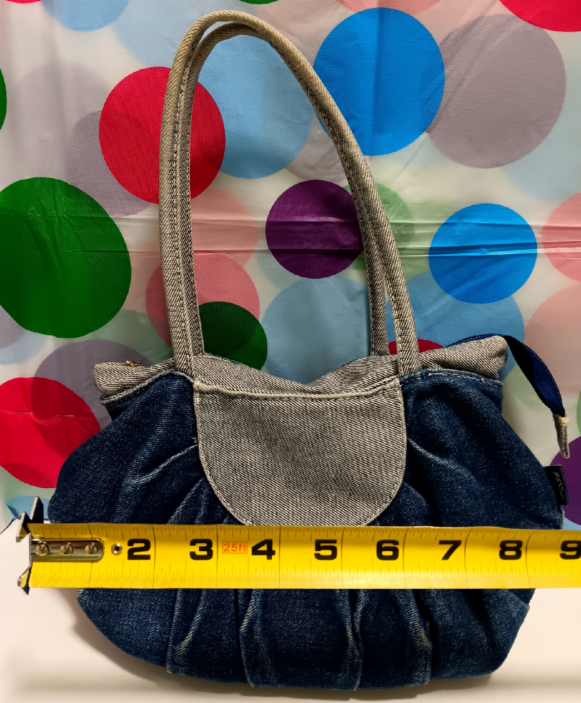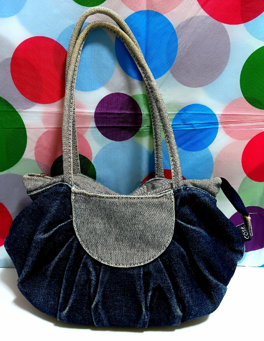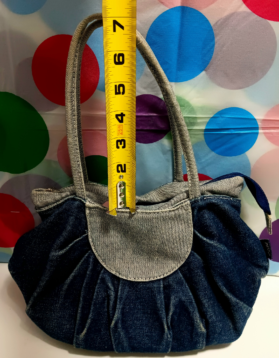 This is a cute denim purse that features a unique rounded design and a comfortable handle for easy carrying. Despite being a used item, it remains in excellent condition. Perfect for adding a touch of casual flair to your outfit!