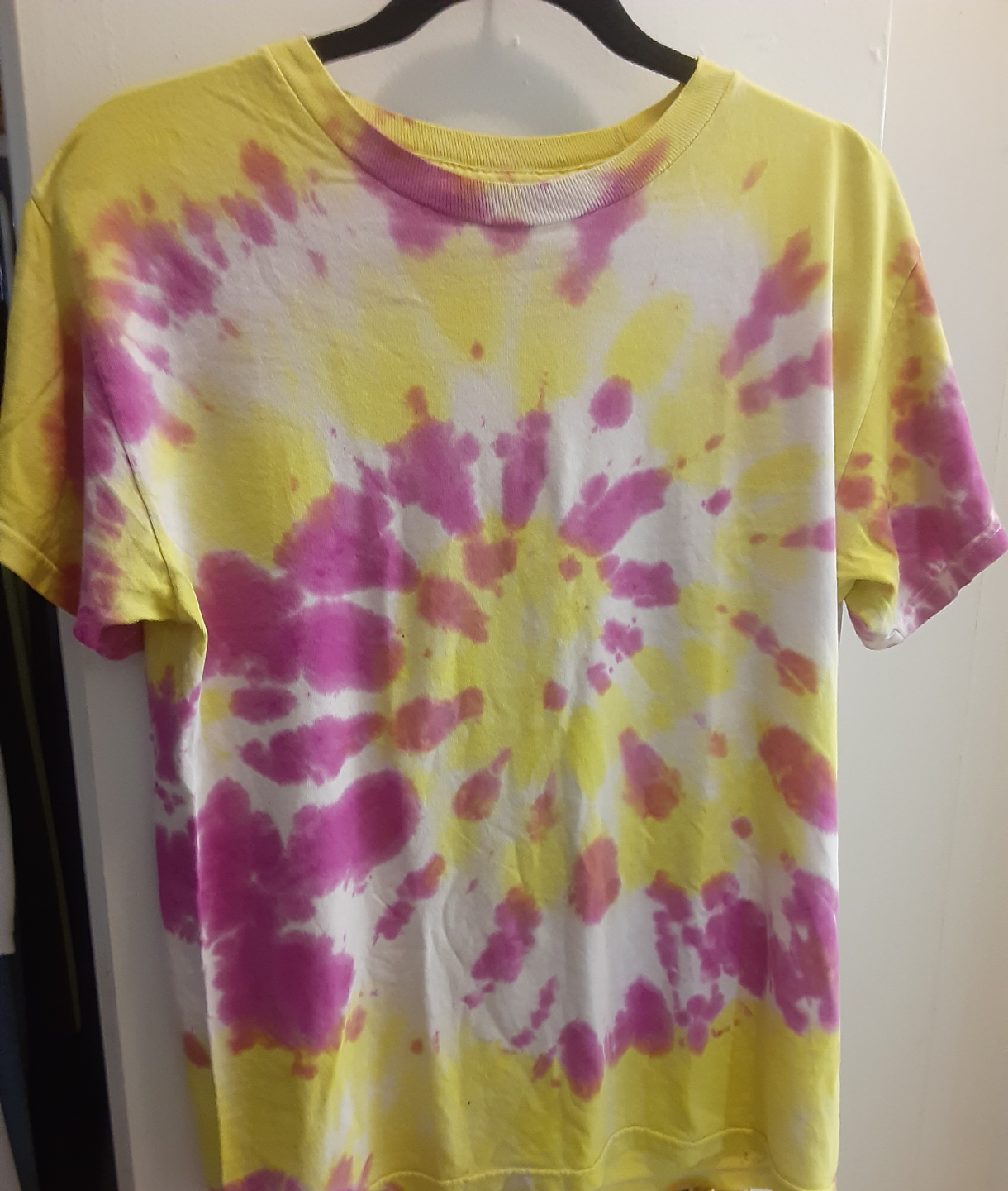 Selling a fun tie-dye t-shirt with a vibrant mix of yellow, pink, and white. It's in great condition and ready for a new home! Perfect for adding a pop of colour to your wardrobe