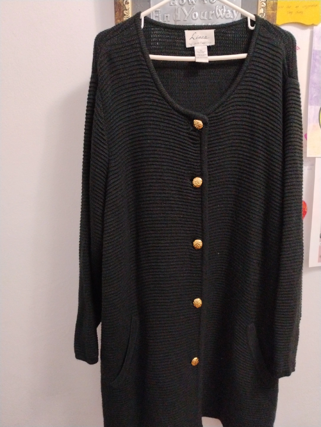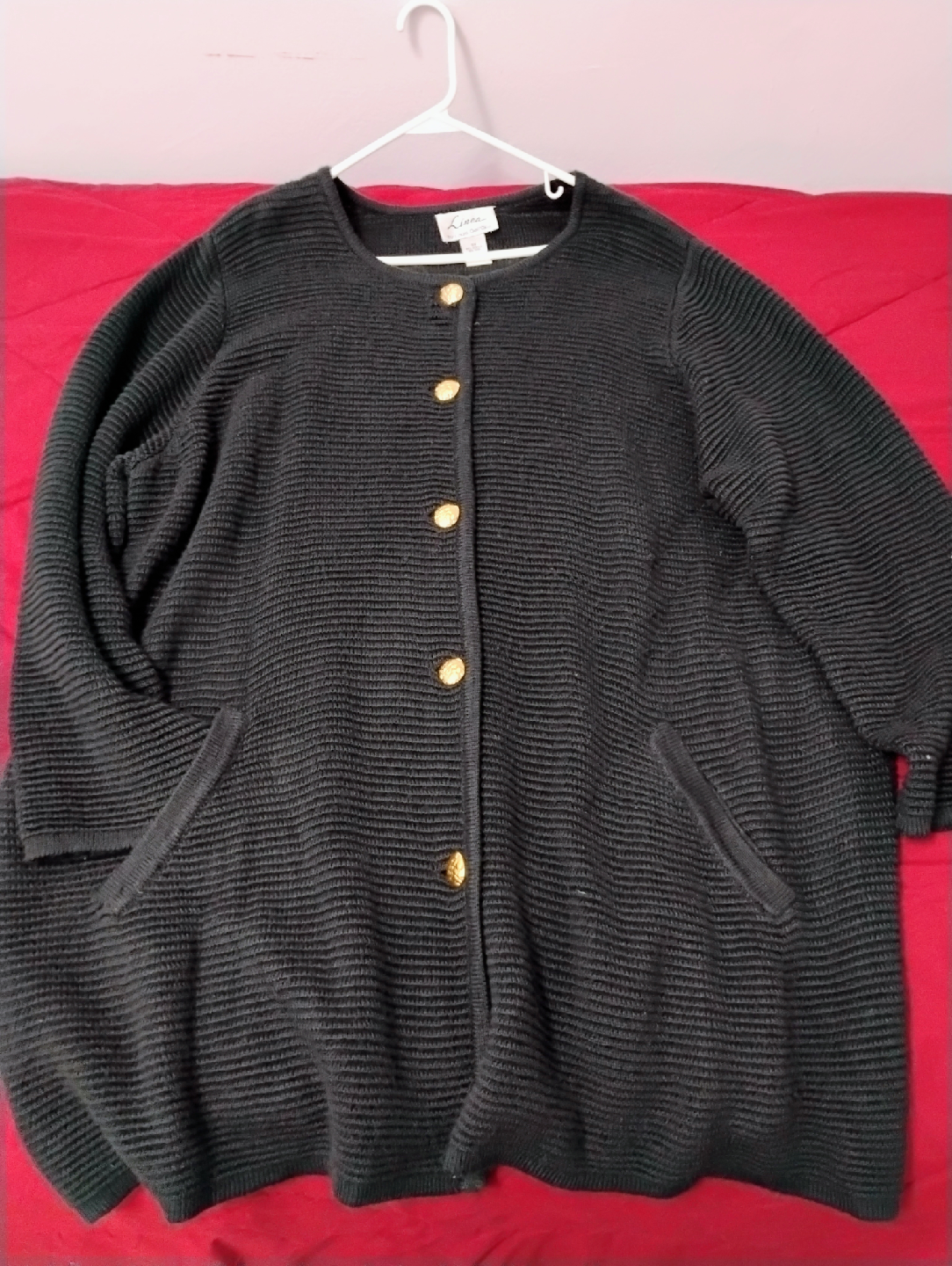 🥕Selling a Linea cardigan sweater. black color with gold buttons. It has a comfortable fit and two pockets in the front. Perfect for layering or wearing on its own