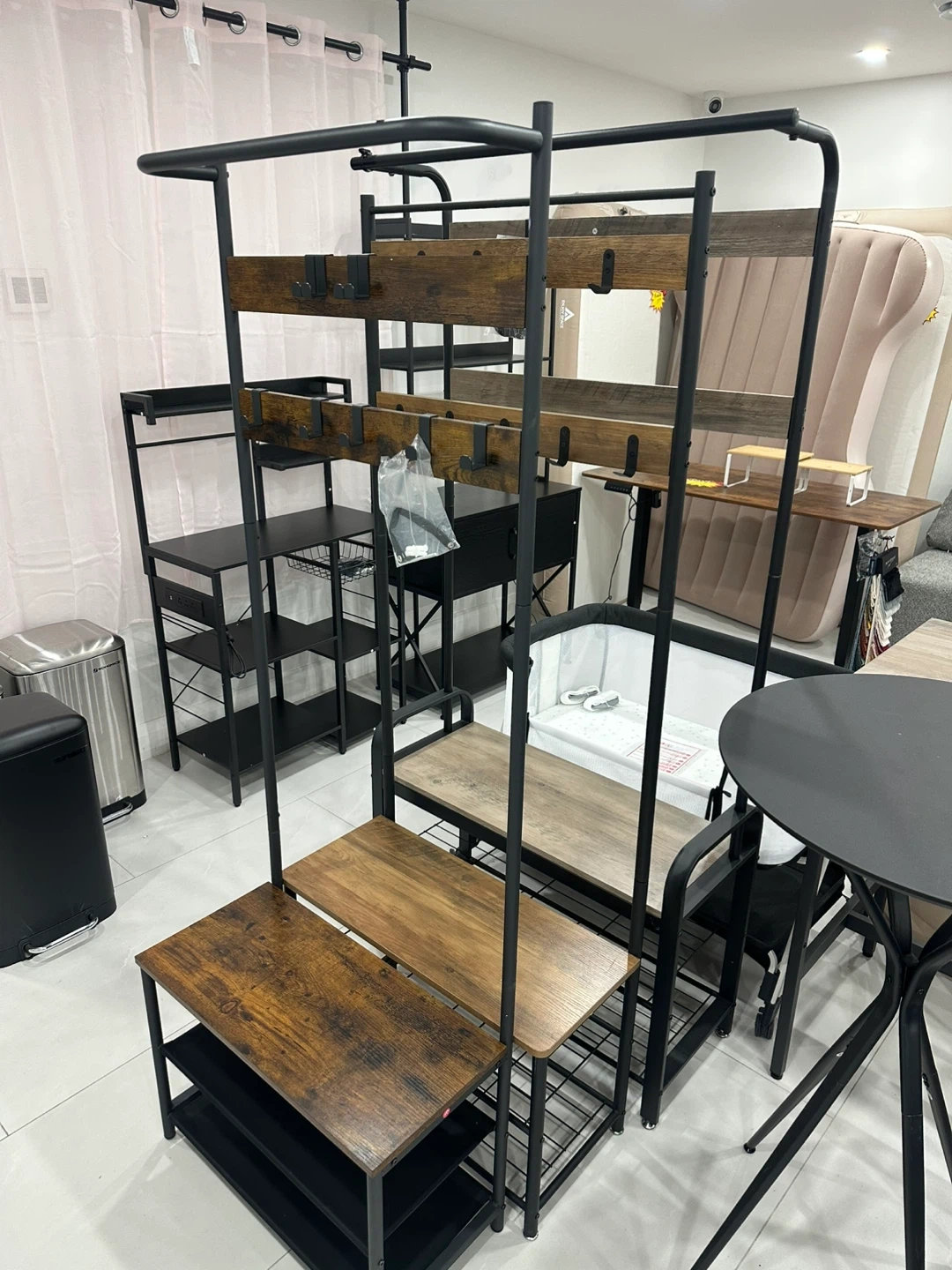 Here's a sturdy garment rack with a rustic brown and black metal finish! It features multiple shelves for storage and a hanging rod for clothes. Great for organizing your wardrobe or adding extra storage space to any room