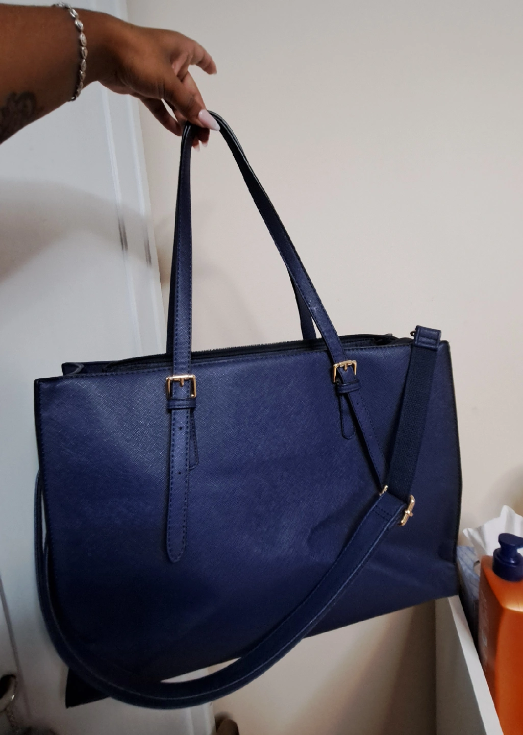 A stylish blue tote bag with gold-tone hardware. It features a zip closure and multiple interior pockets for organization. Includes a detachable shoulder strap for versatile carrying options! Perfect for work or everyday use.