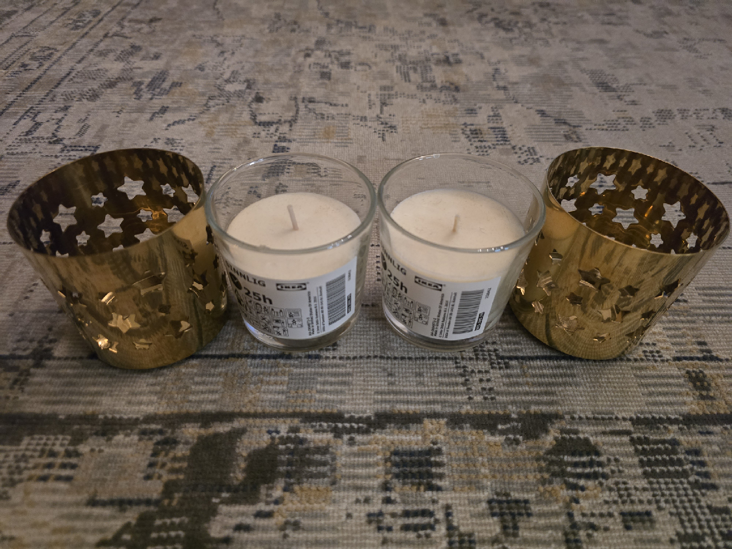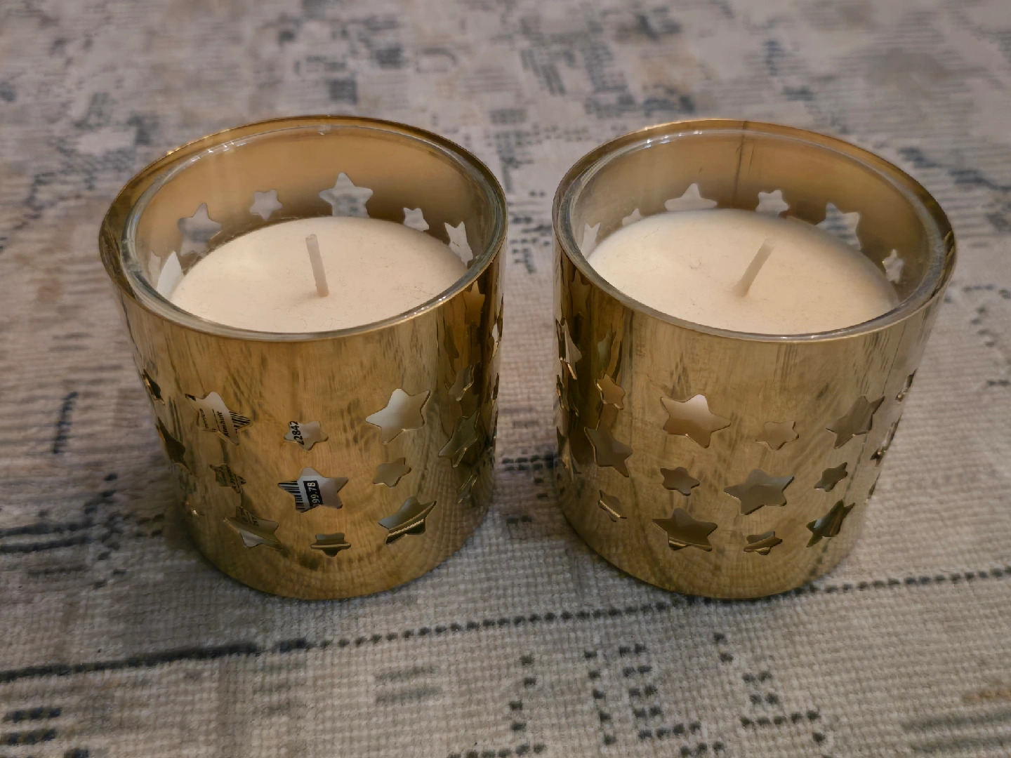 Selling 2 IKEA STÄNNLIG candles with w gold-coloured star-patterned holders.