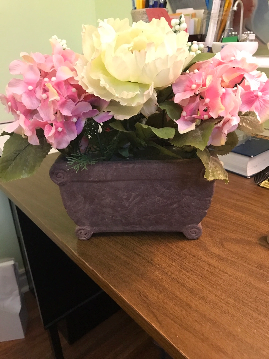 A lovely artificial flower arrangement, perfect for adding a touch of colour to any room. The arrangement features a mix of pink, white, and purple flowers in a dark brown pot. It's in great condition and ready to brighten up your space!
