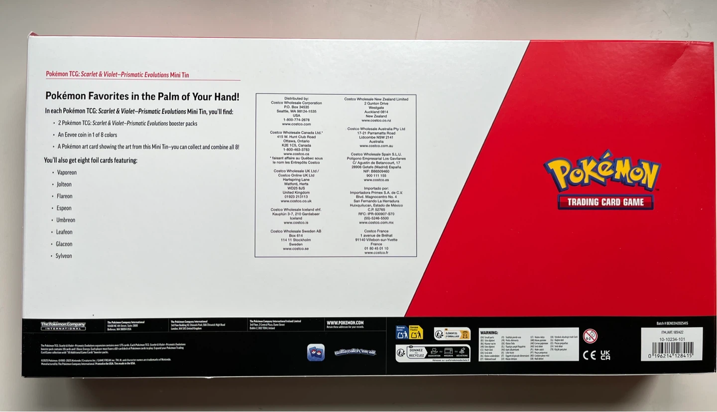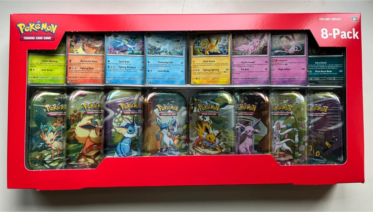 Have an extra sealed box. Complete set of 8 mini tins (each containing 2 Prismatic Evolutions booster packs and collectible coin) and 8 foil Eeveelution promo cards. Perfect for any trainer or collector!