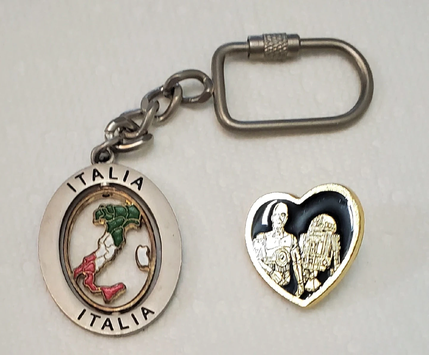 18Selling a keychain featuring a map of Italy with 'ITALIA' text around it, and a Star Wars pin in the shape of a heart with C-3PO and R2-D2 only available for pick up