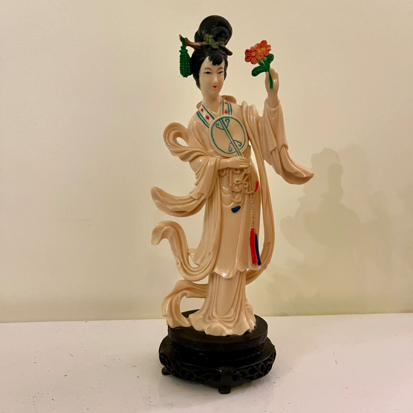 This vintage celluloid Geisha figurine is a unique and charming piece, hand-painted with delicate details, and holding a flower. This lovely figure is in good condition.