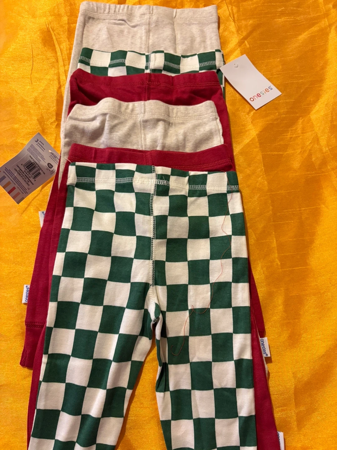 Selling a set of three baby leggings from Onesies! Includes one pair each in red, gray, and a green and white checkered pattern. Perfect for keeping your little one cozy and stylish.