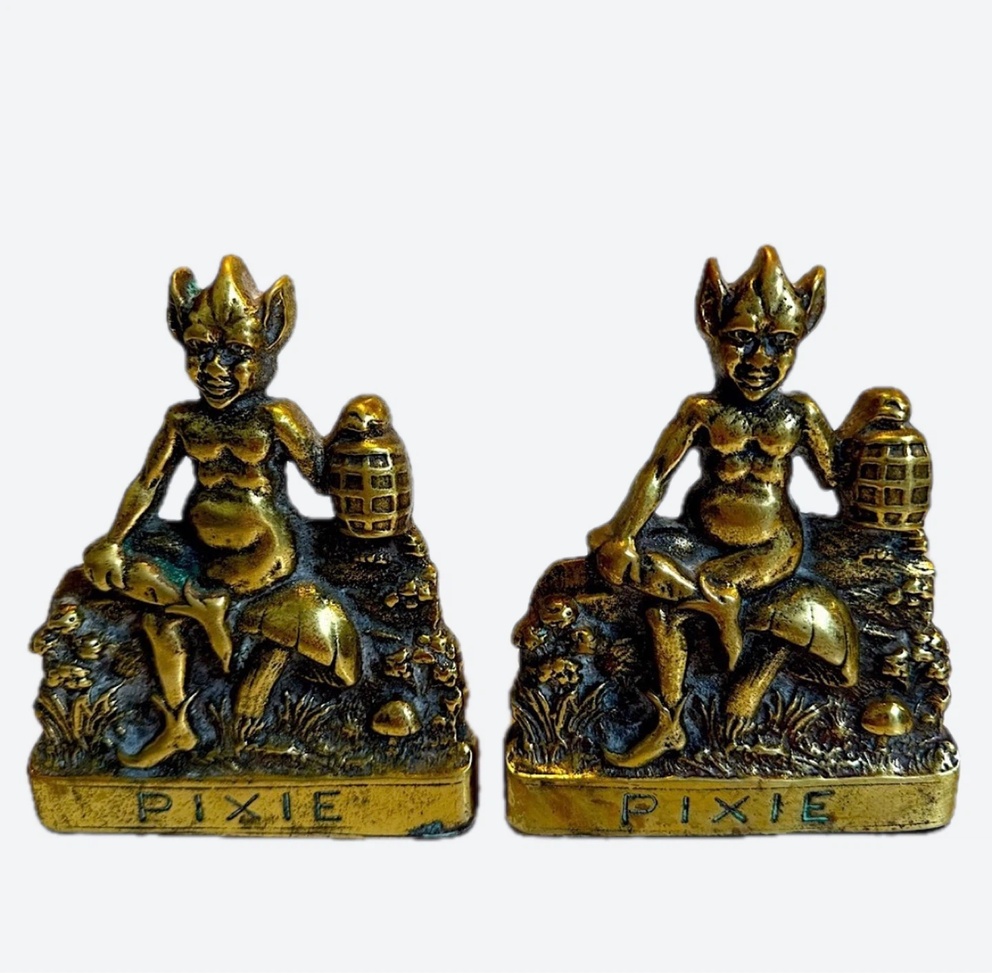 These bookends feature a pixie or elf figure holding a lantern, sitting on a mushroom amidst foliage, with "PIXIE" embossed on the base.